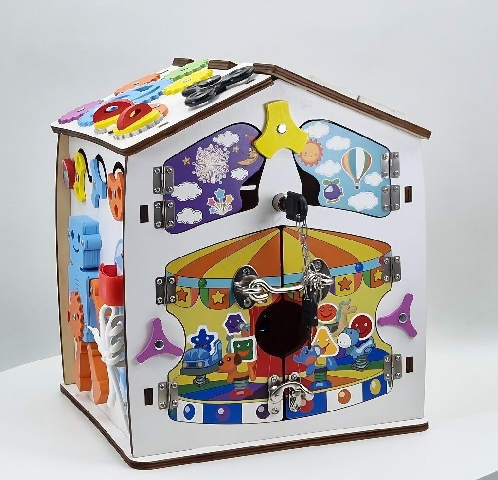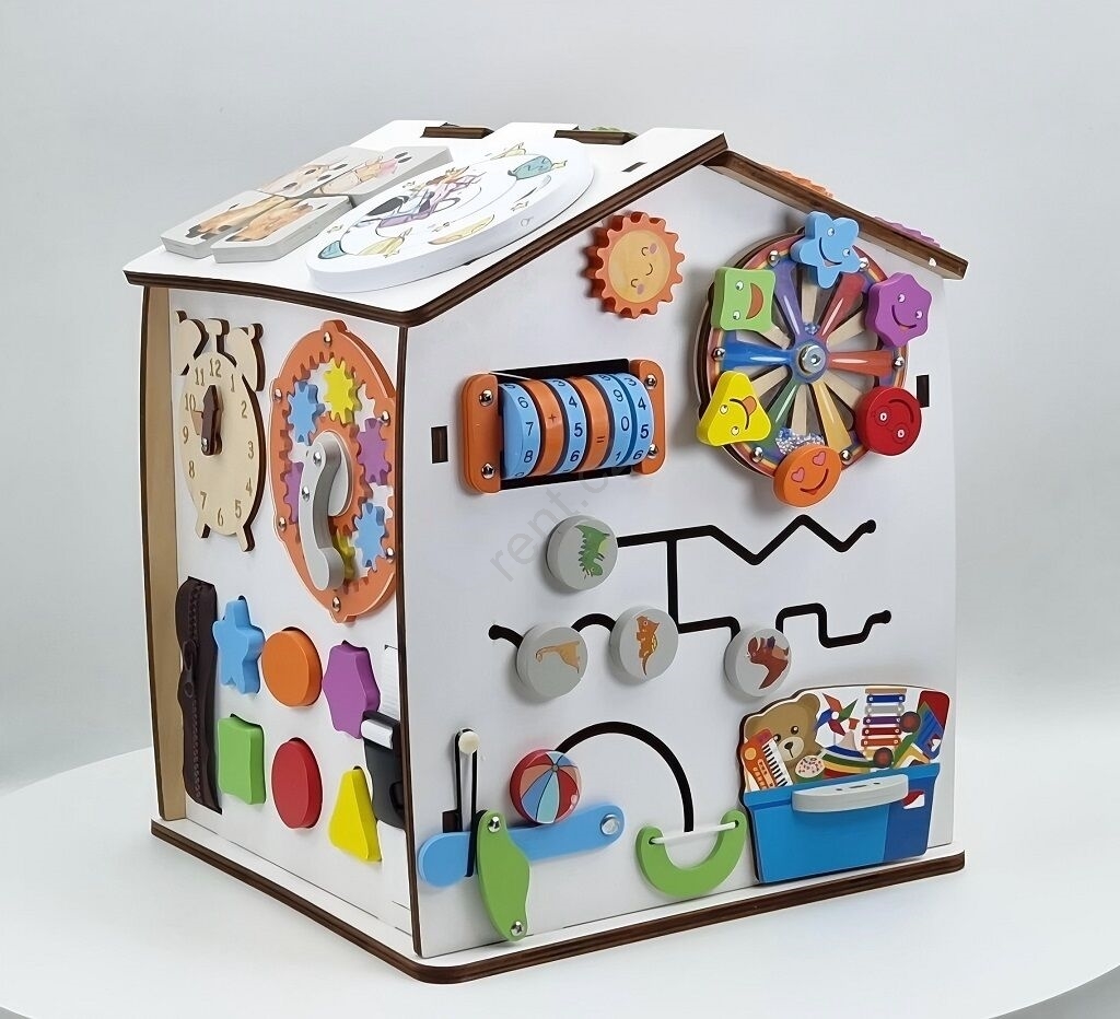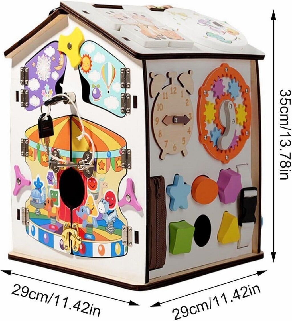 • Dřevěný activity board domeček plný hravých prvků.