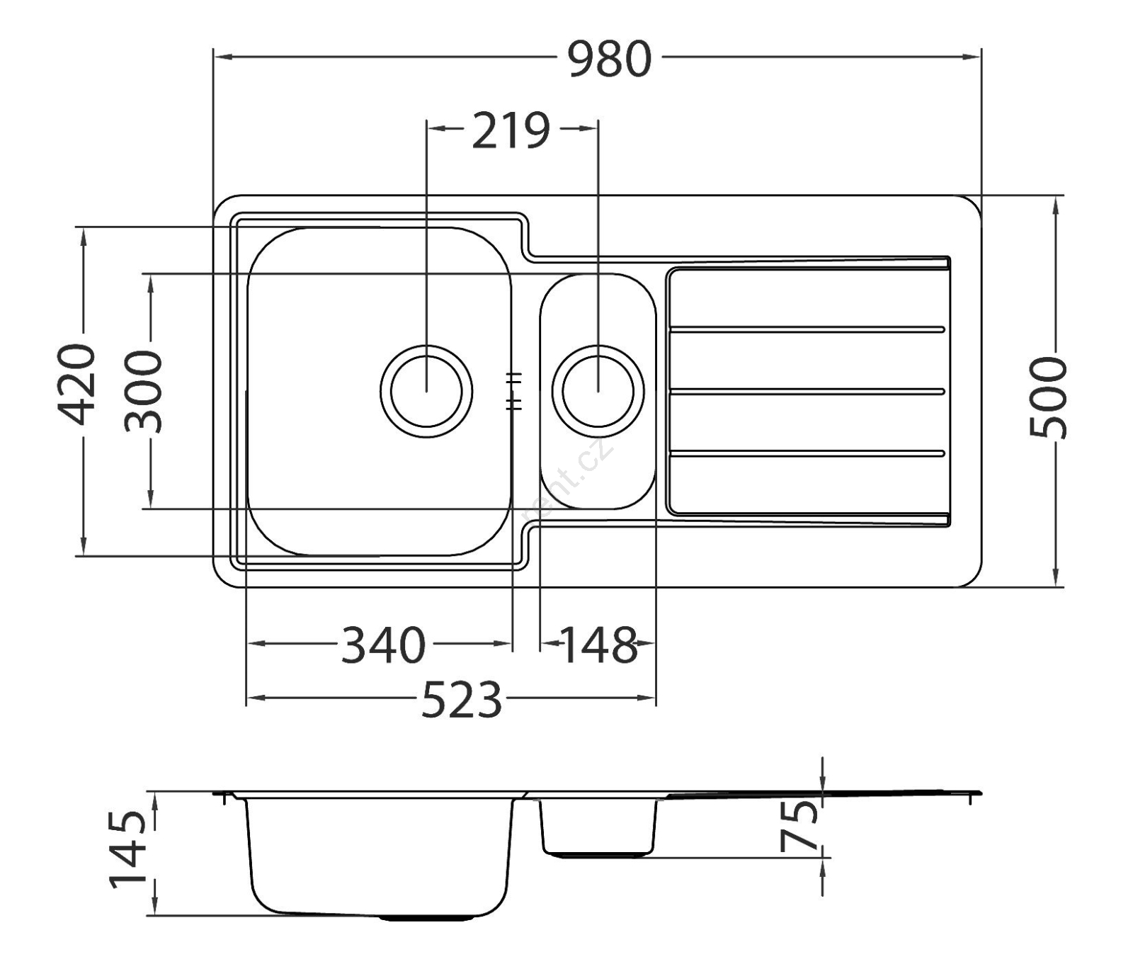 • Dřez s jedním velkým a jedním menším dřezem.