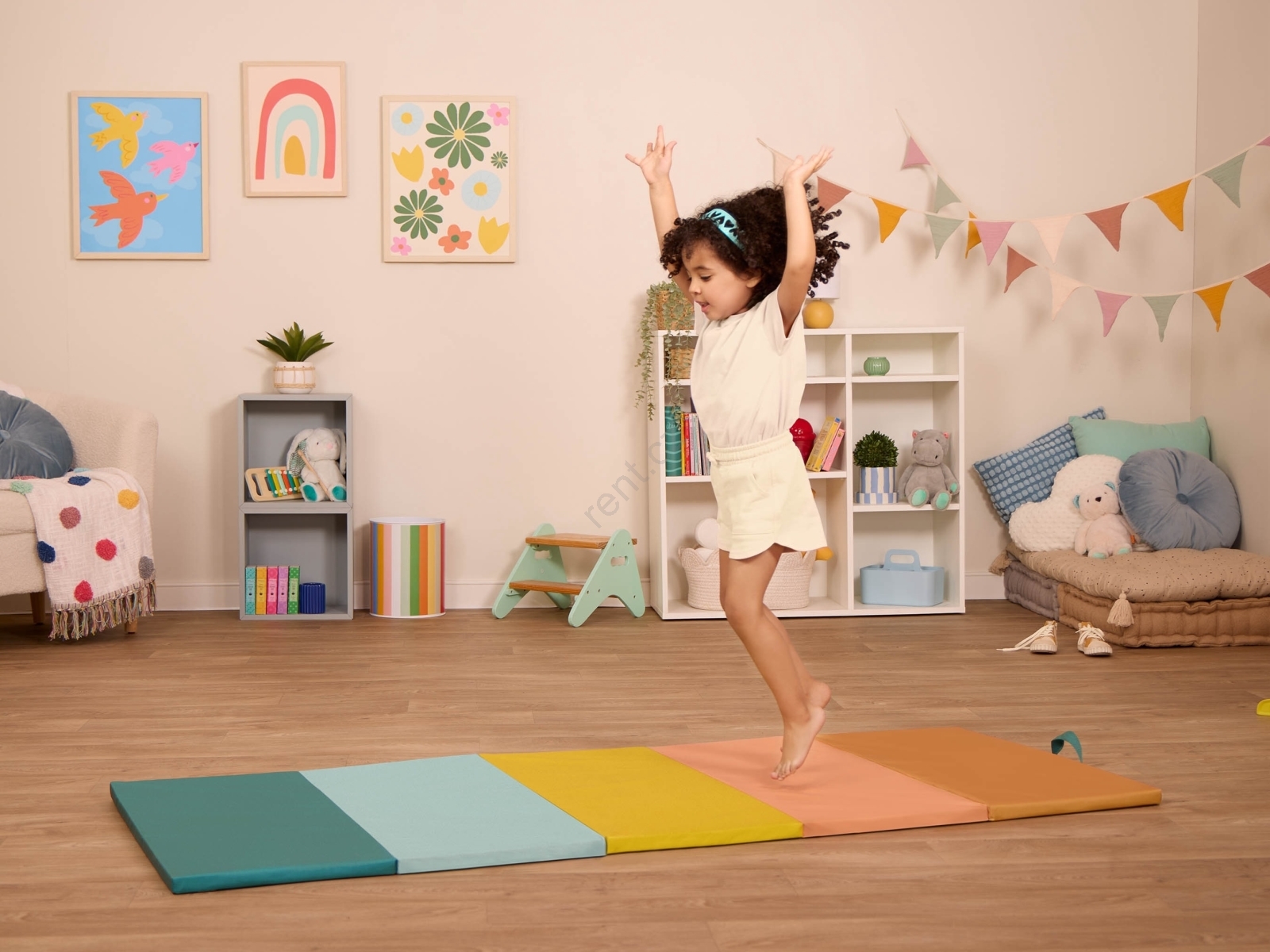 • Podložka je tvořená pěti měkkými pěnovými panely, které se snadno rozloží do prostorné podložky na skákání, cvičení, tancování apod.