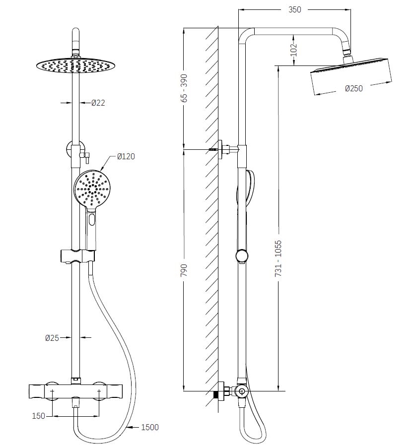• Sprchová tyč a vrchní sprcha z nerezové oceli s povrchovou úpravou PVD.