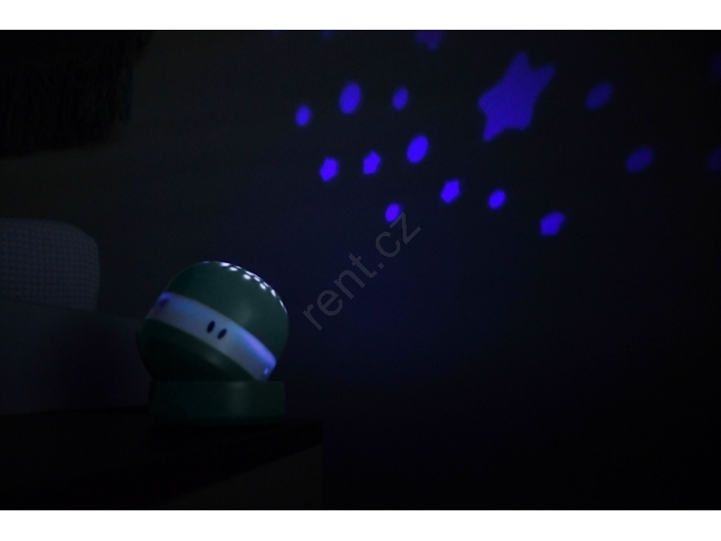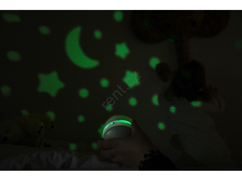 • Senzor pláče automaticky aktivuje projektor při detekci pláče, přičemž zapne červené světlo a hudbu.