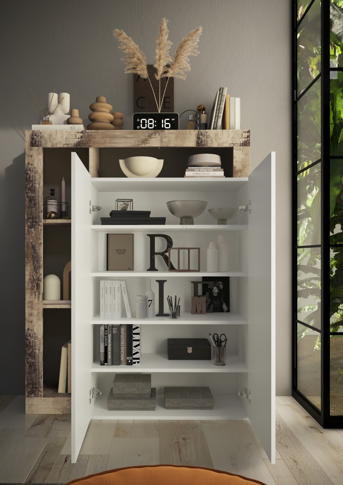 • Disponuje 4 otevřenými policemi, a 5 vnitřními přihrádkami na uložení tašek, bot a sezónních věcí.