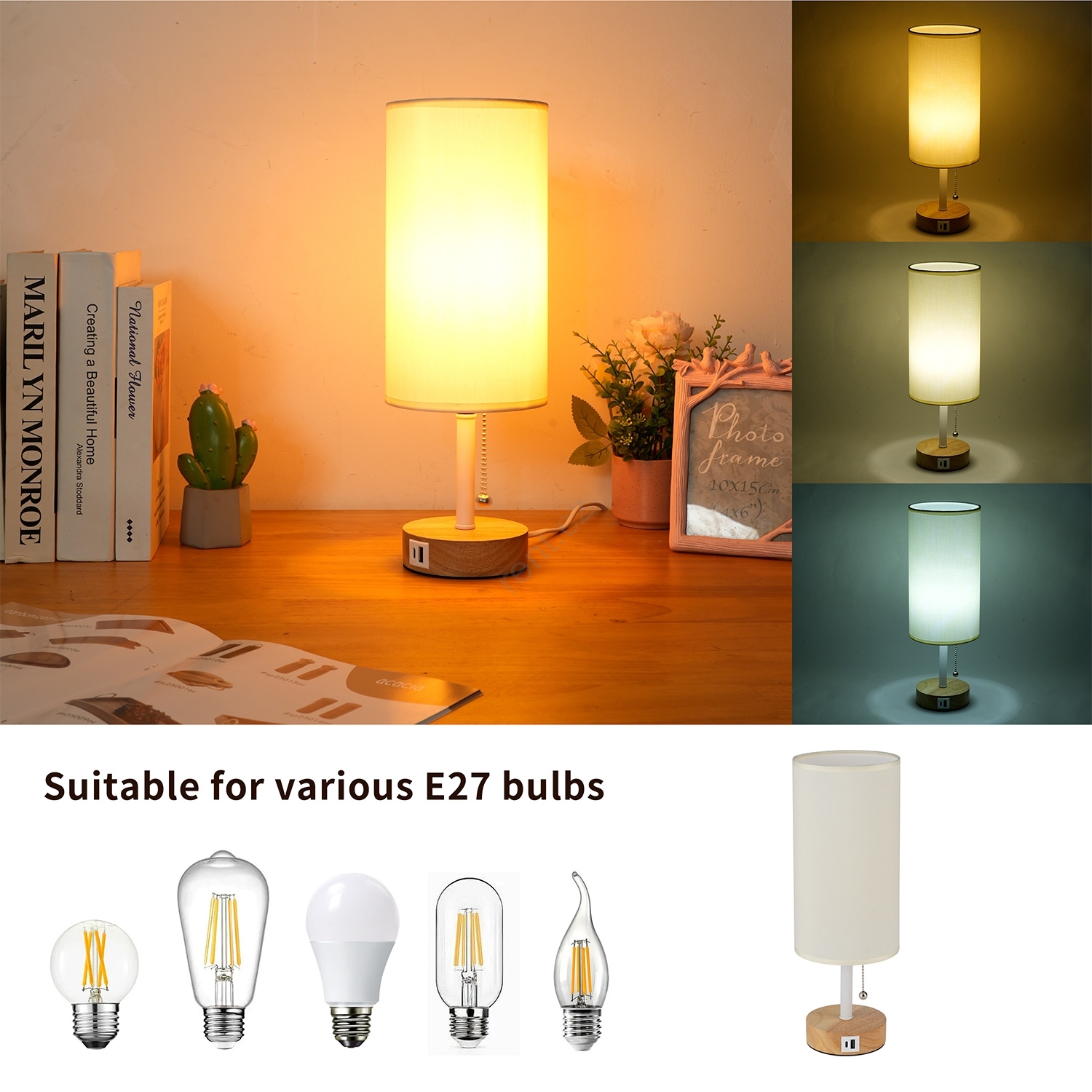 Brilagi - Stolní lampa s USB portem TABLON 1xE27/25W/230V dub/bílá/krémová
