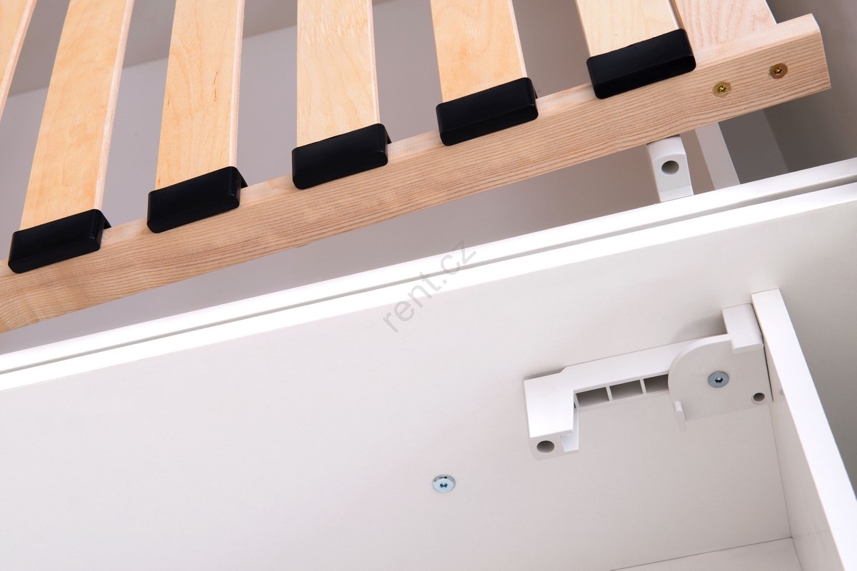 • Postel je vybavena velkým úložným prostorem se vstupem od nohou pro uskladnění lůžkovin a dalších předmětů.