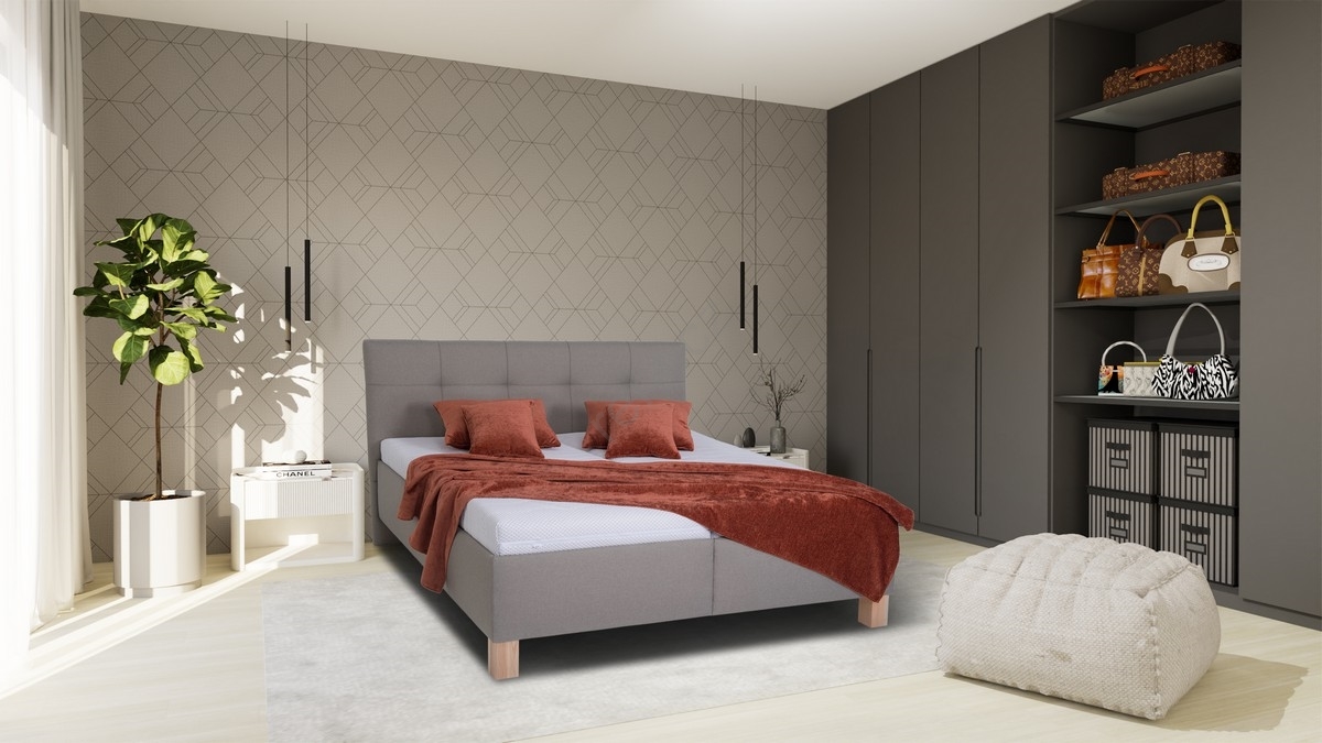 • Čalouněná dvoulůžková postel s volně loženými matracemi se pyšní detailně propracovaným, elegantně prošitým čelem.