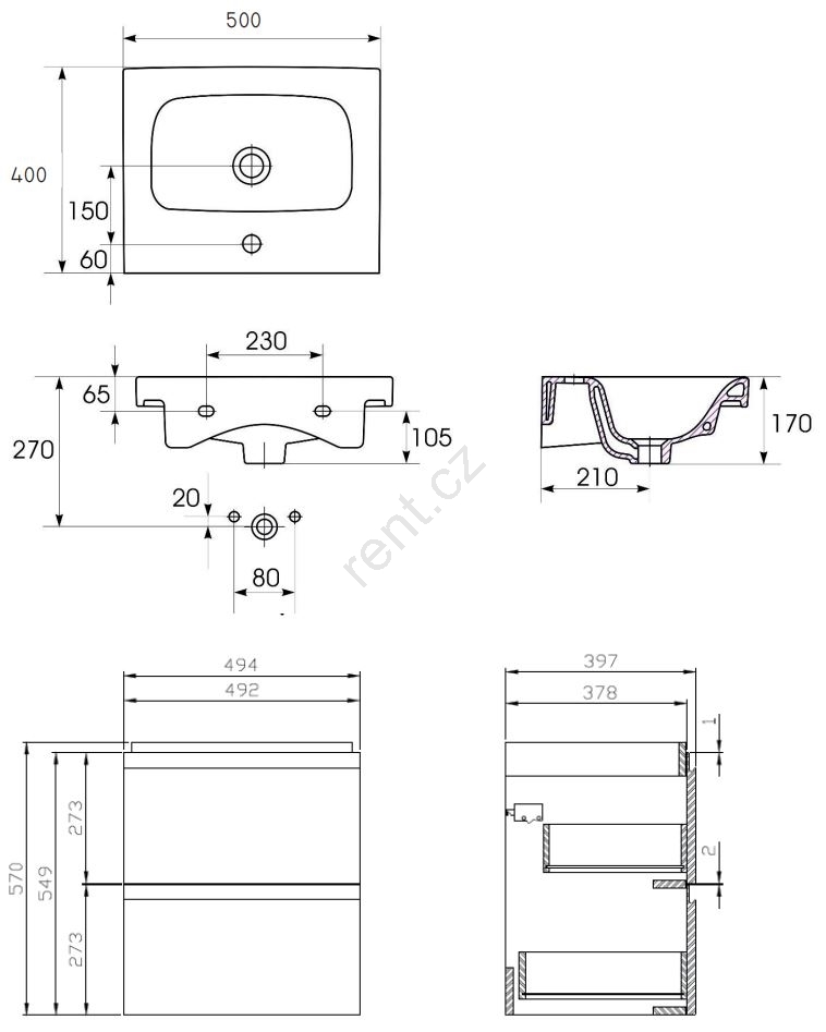 • Keramické umyvadlo má klasický obdélníkový tvar s otvorem pro baterii a přepadem.