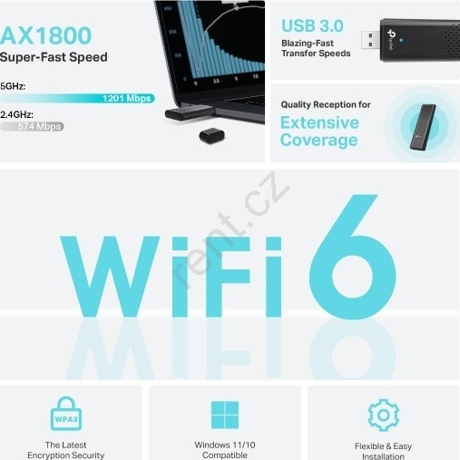 • Rychlá Wi-Fi 6 - Prolomte gigabitové hranice s rychlostmi až 1201 Mb/s (5 GHz) + 574 Mb/s (2.4 GHz).
