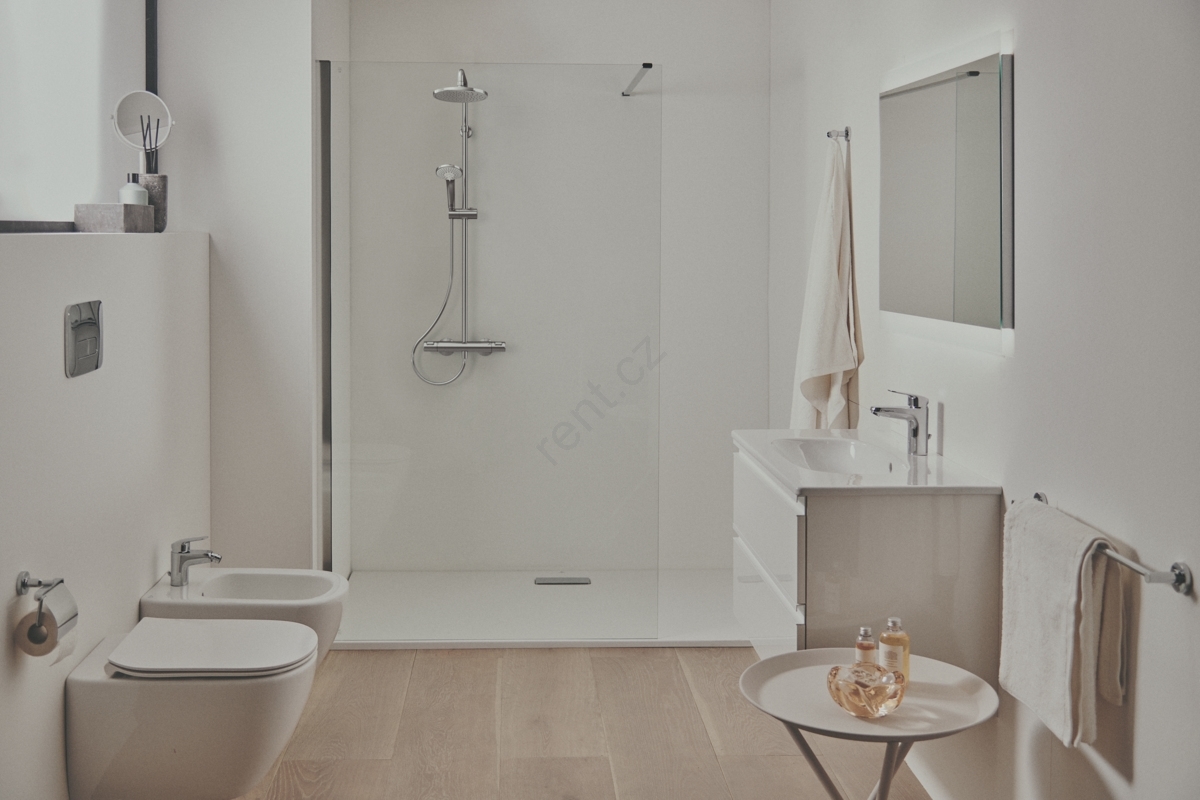 • Ruční sprcha Idealrain o průměru 100 mm nabízí tři proudy (Rain, Fine Rain, Massage), omezovač průtoku na 8 l/min a technologii Anti-kalk pro snadnou údržbu.