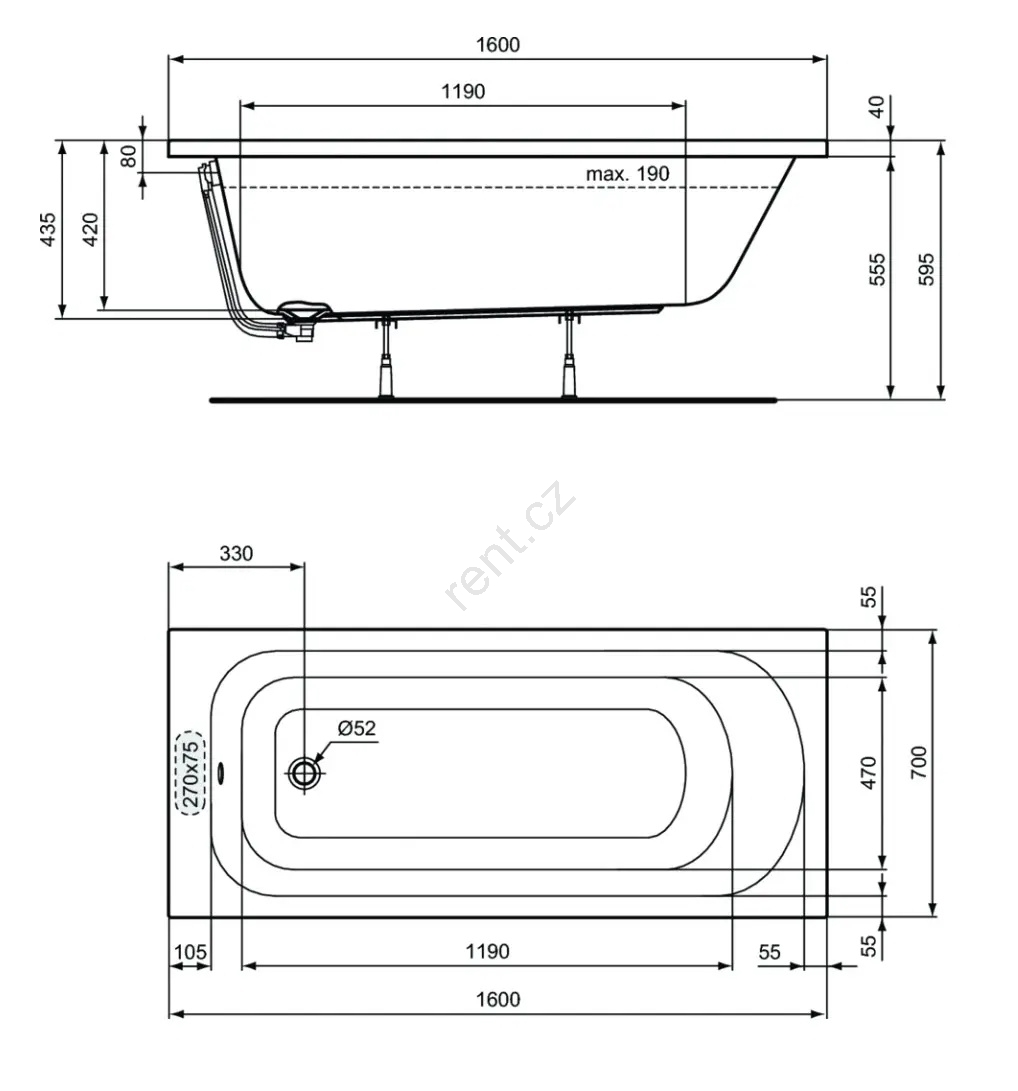 • Rozměry vany činí 1600 x 700 mm s hloubkou 435 mm a celkovým objemem 191 litrů.