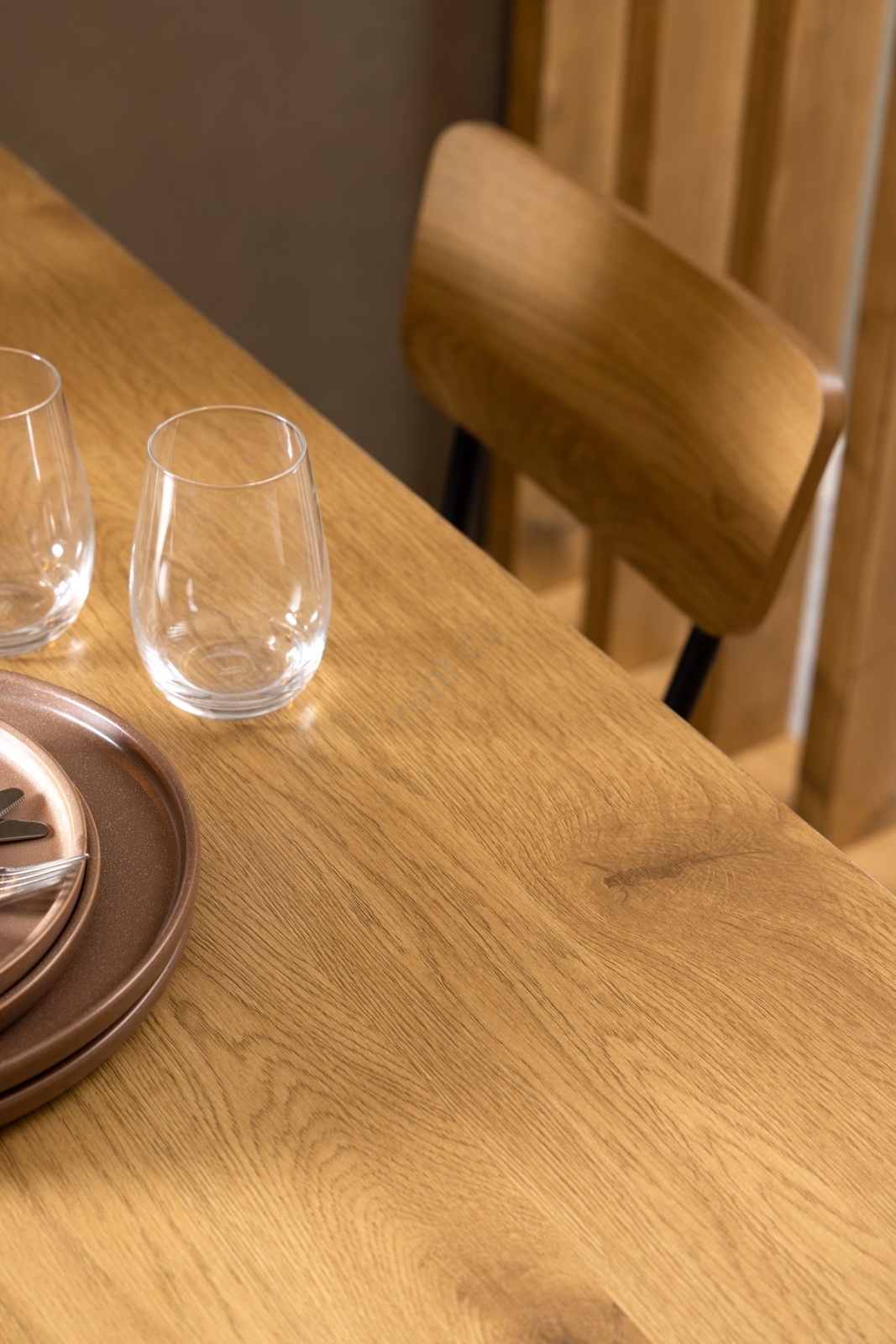 • Obdélníkovou jídelní desku ve vzhledu dubu podpírají štíhlé černé ocelové nohy.