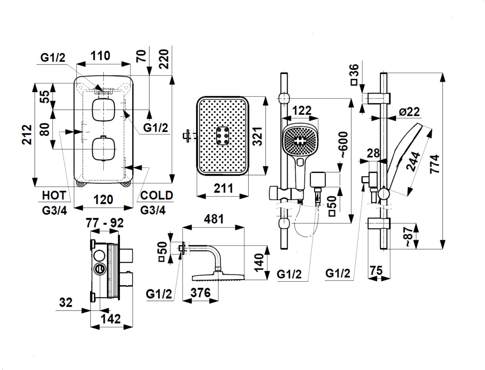 • Balení obsahuje: podomítkový box, kompletní baterie, rameno, sprchový disk s hadicí, skrytá posuvná sprcha.