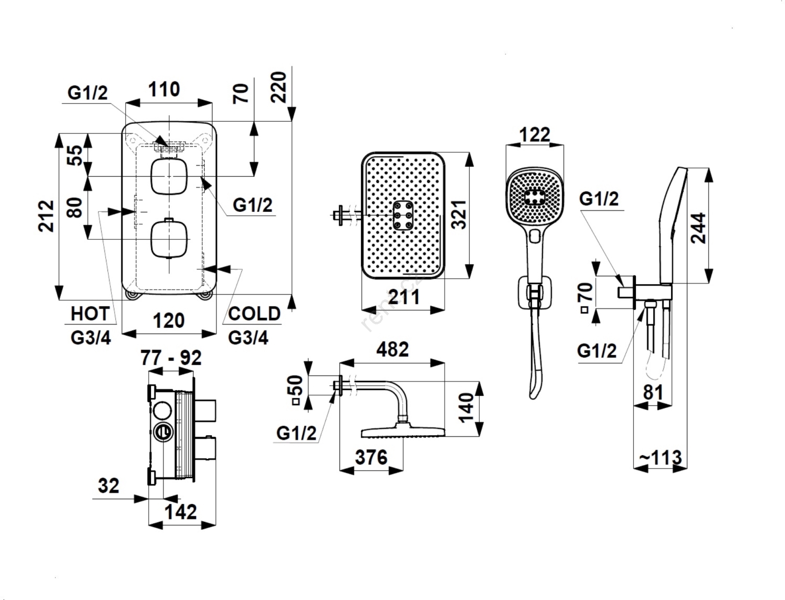 • Balení obsahuje: podomítkový box, kompletní baterie, rameno, sprchový disk s hadicí, podomítkové nástěnné úhlové přípojné těleso.