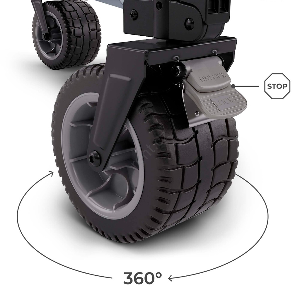• Velká terénní PVC kola o šířce 10 cm si snadno poradí s pískem, trávou i štěrkem, takže vozík zůstává stabilní i na nerovném povrchu.
