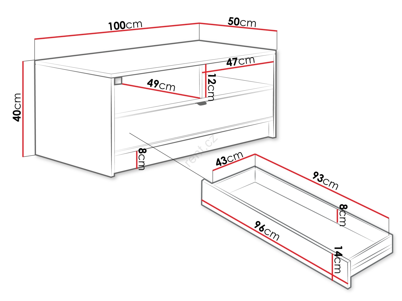 • Vyrobeno z laminované desky o tloušťce 16 mm (korpus) a kvalitní MDF desky o tloušťce 18 mm (čelo).