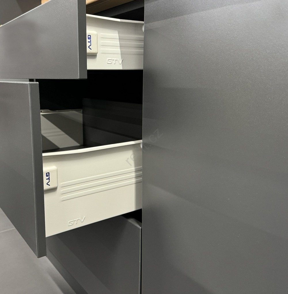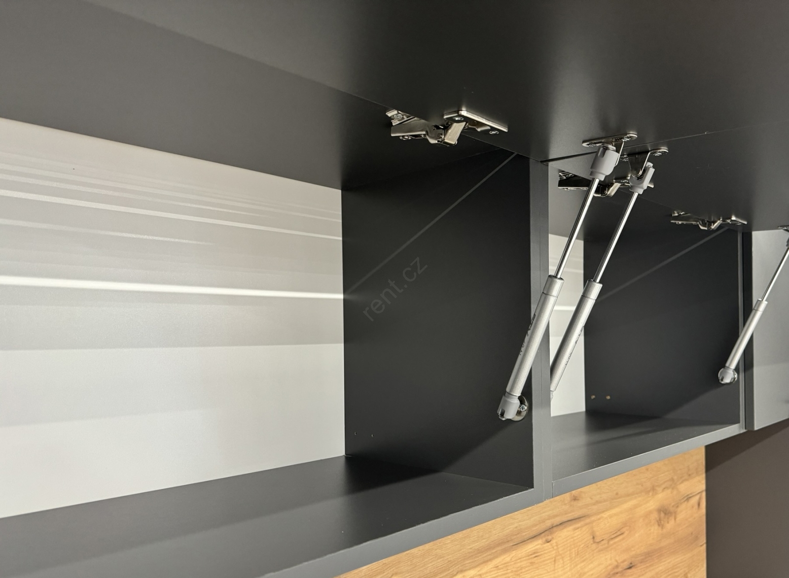 • Horní skříňky jsou opatřeny plynovými písty, v zásuvkách jsou zabudovány kvalitní zapouzdřené kovové pojezdy.