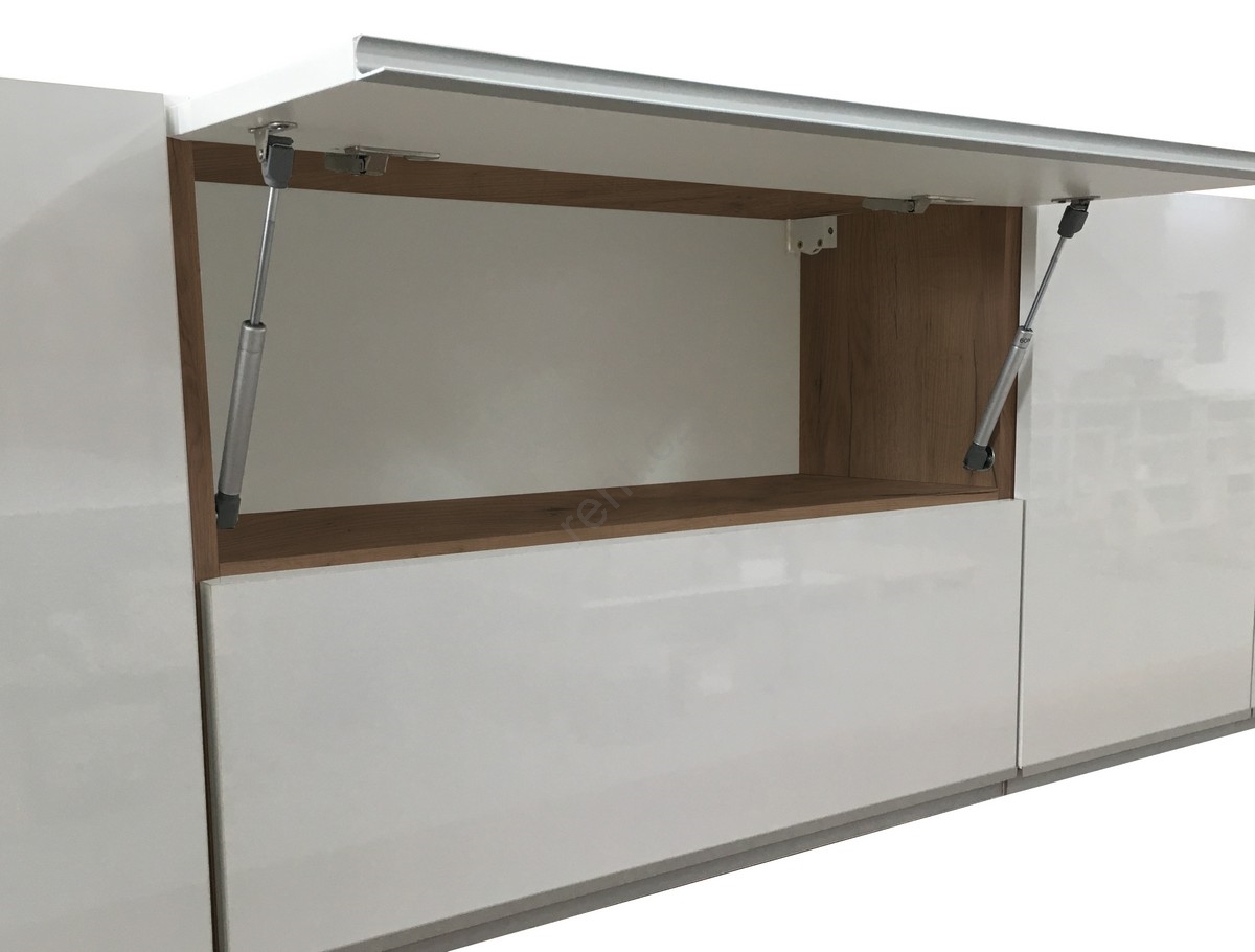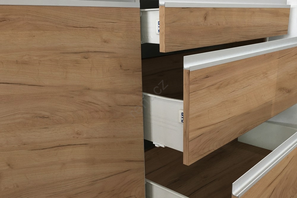 • Horní skříňky jsou opatřeny plynovými písty, v zásuvkách jsou zabudovány kvalitní zapouzdřené kovové pojezdy.