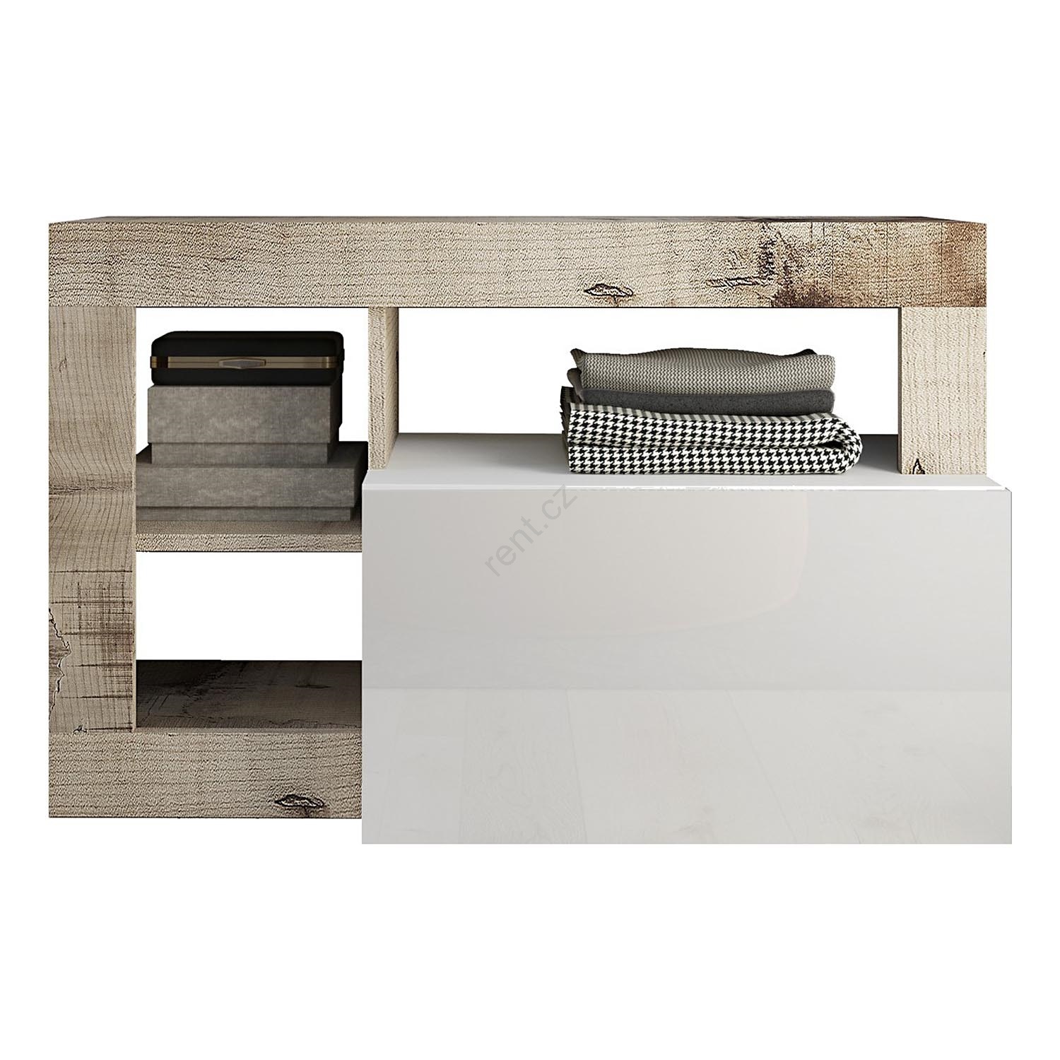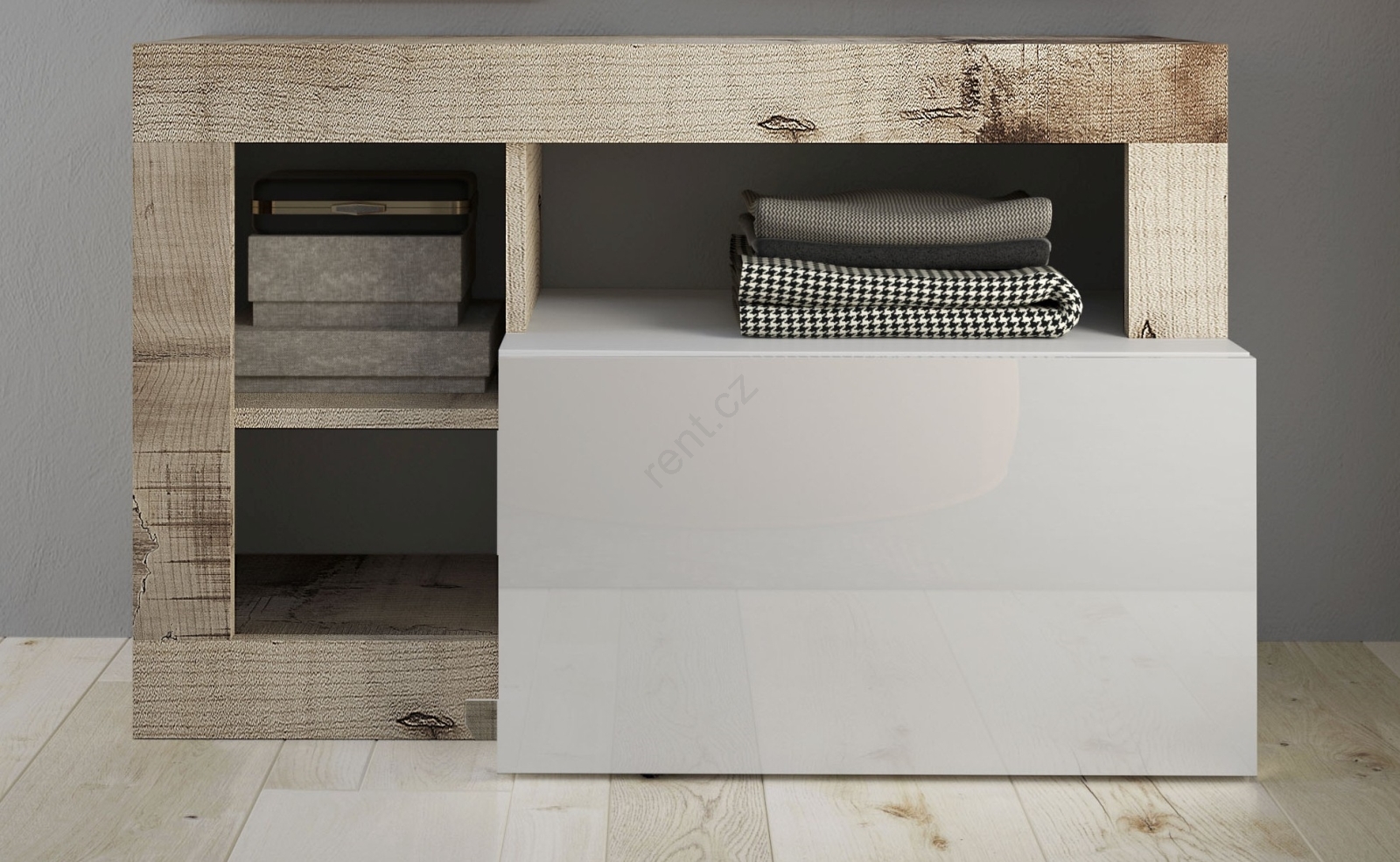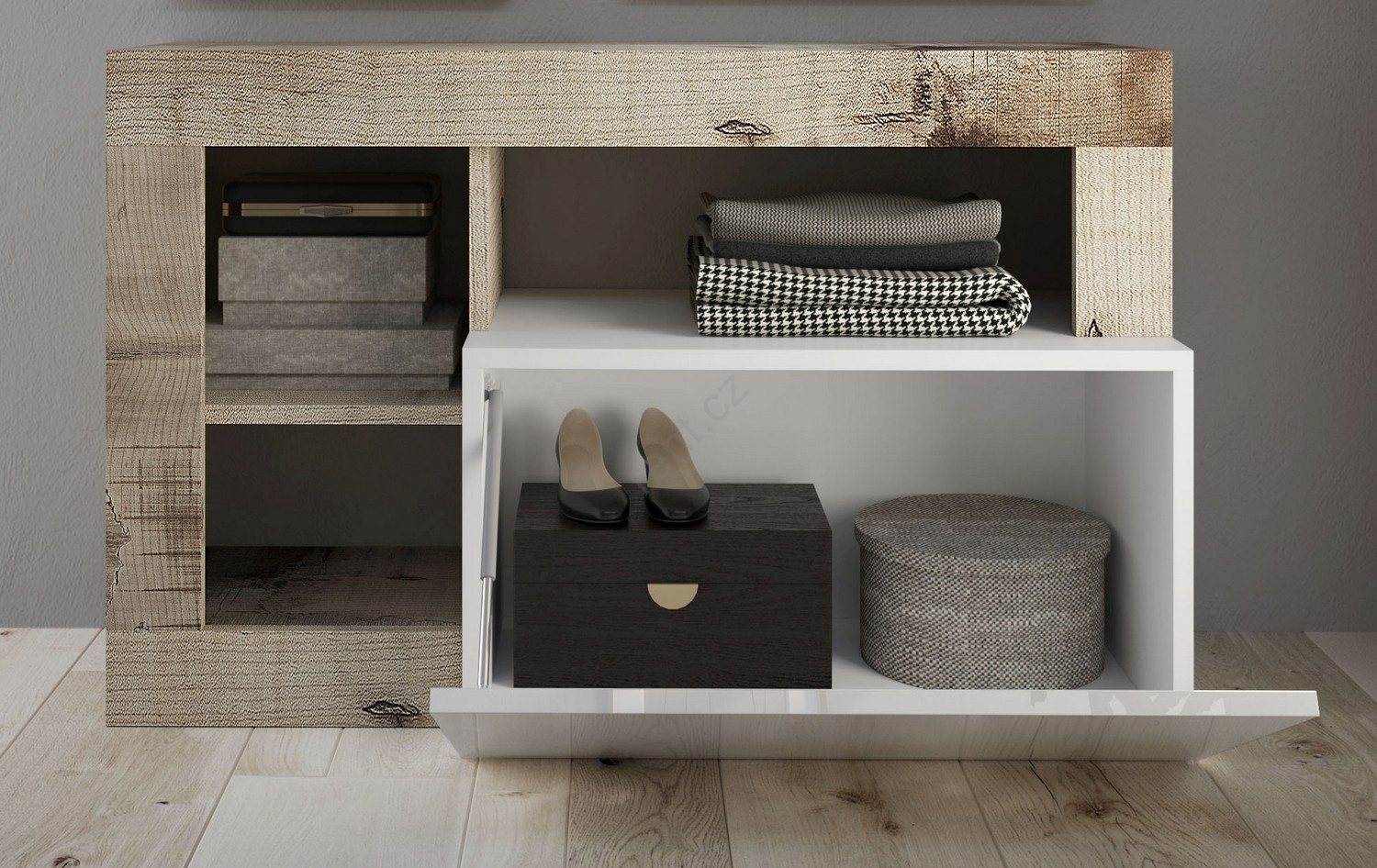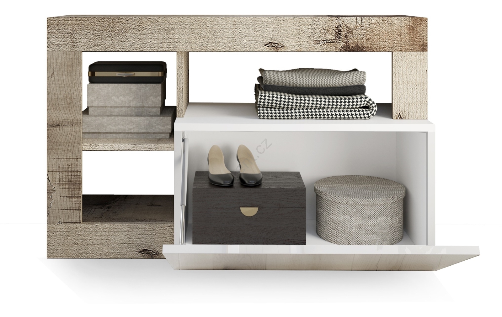 • Disponuje 3 otevřenými policemi, a vnitřní policí s výklopným otevíráním na uložení tašek, bot a sezónních věcí.