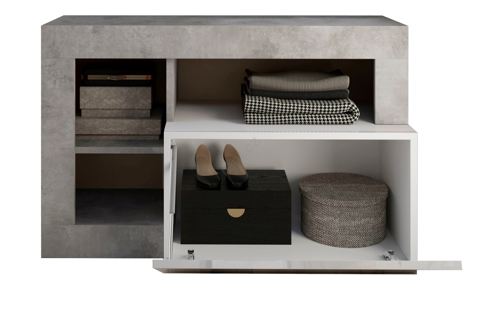 • Disponuje 3 otevřenými policemi, a vnitřní policí s výklopným otevíráním na uložení tašek, bot a sezónních věcí.