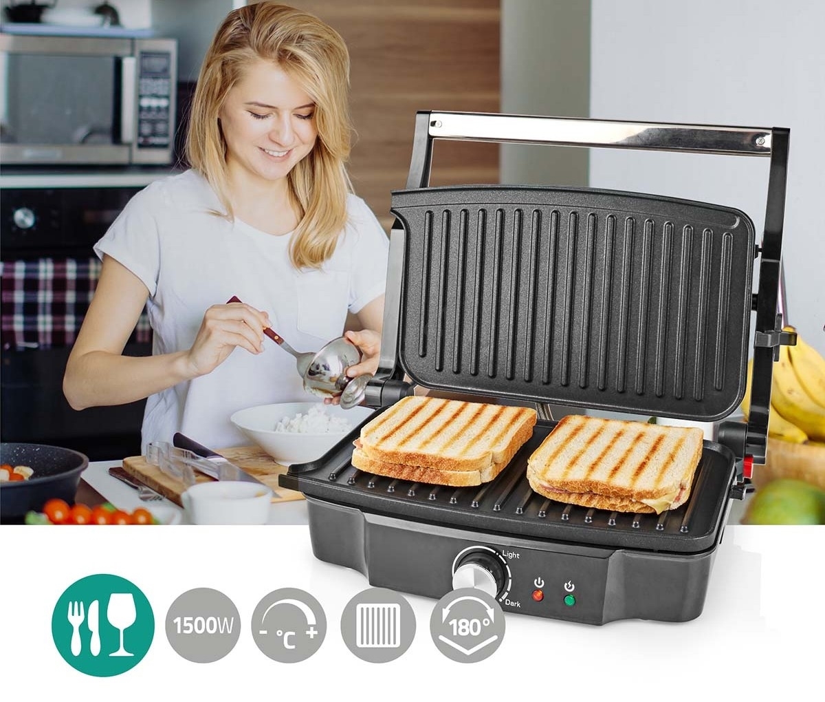• Opečte si skvělé panini nebo si ogrilujte maso, rybu nebo zeleninu s tímto kontaktním grilem.