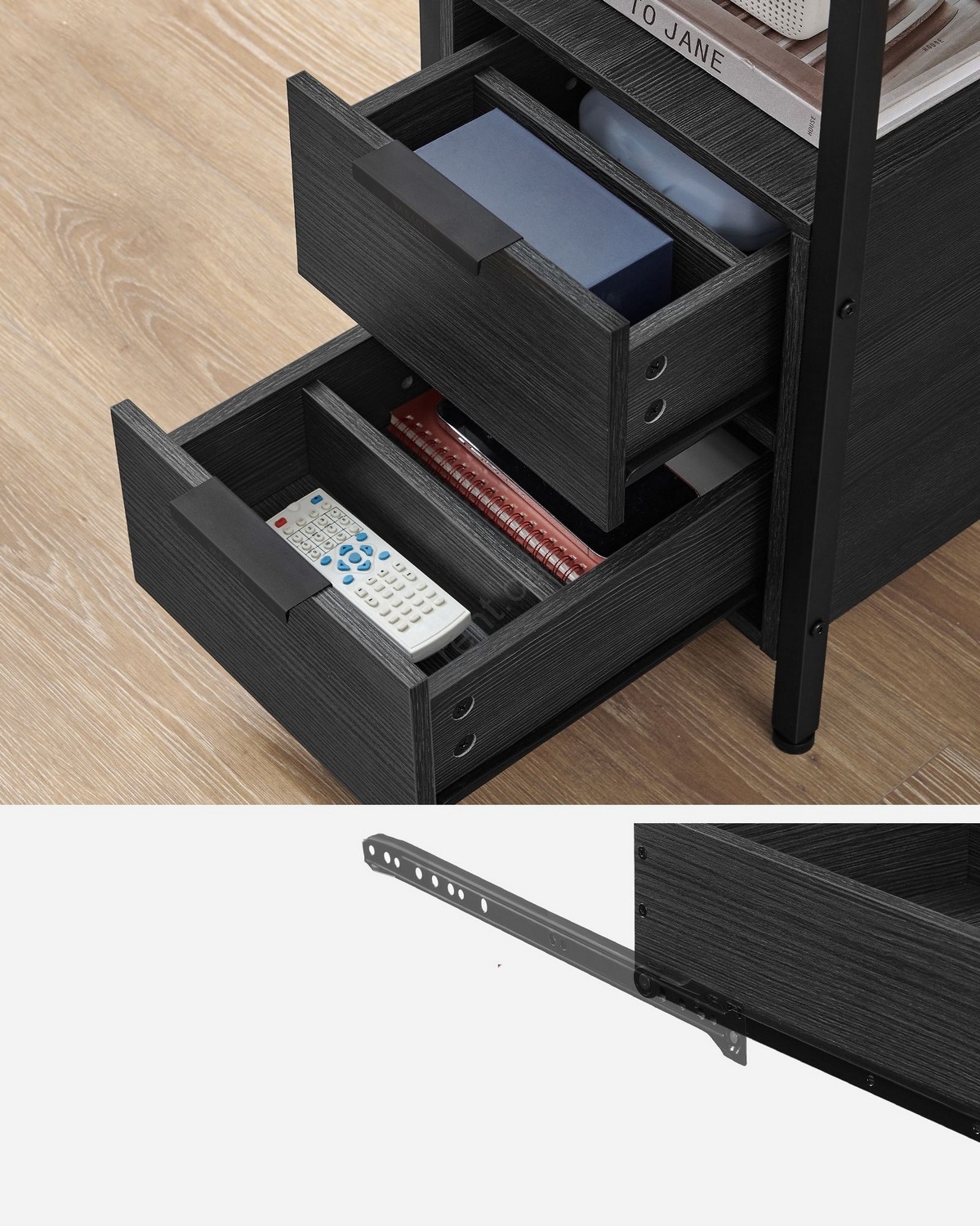 • Do 2 zásuvek, které si přizpůsobíte dle sebe, vložte svůj knihy, elektroniku, kabely, psací potřeby a další věci.