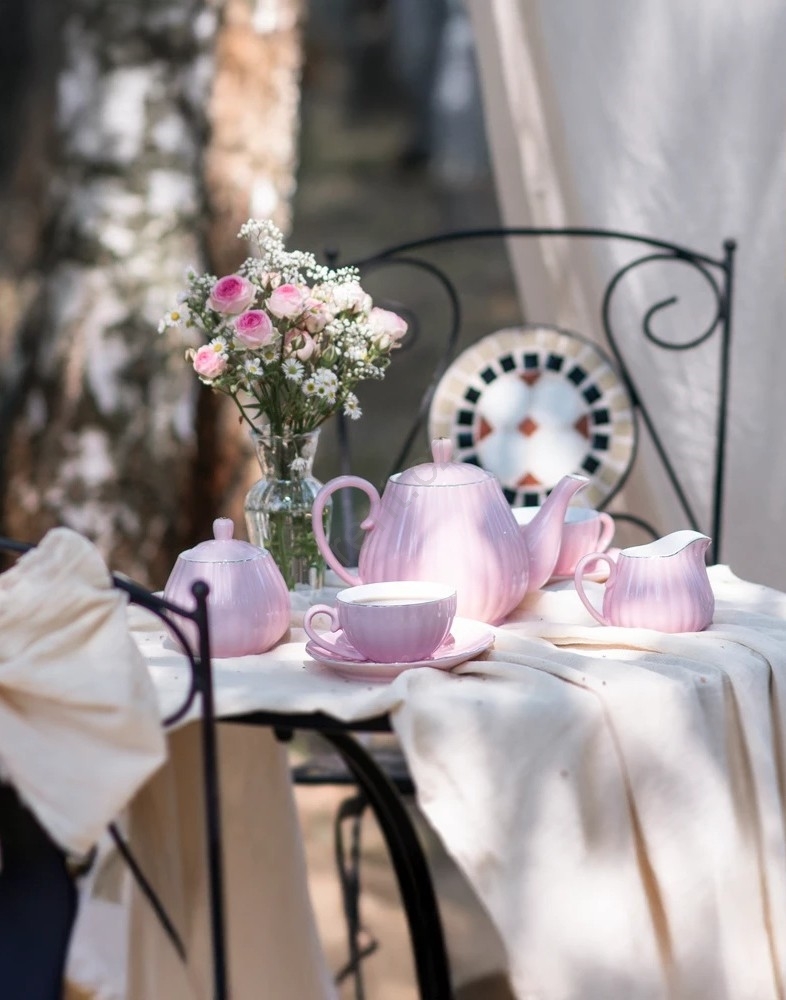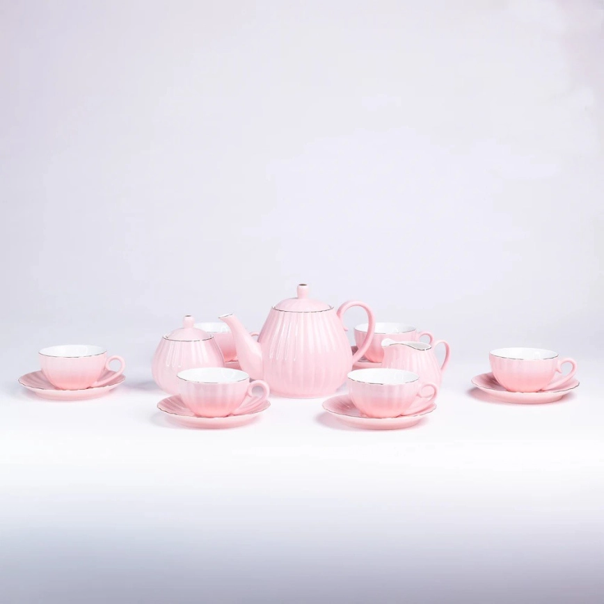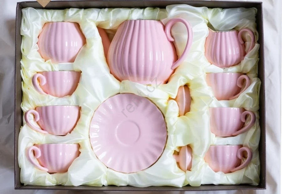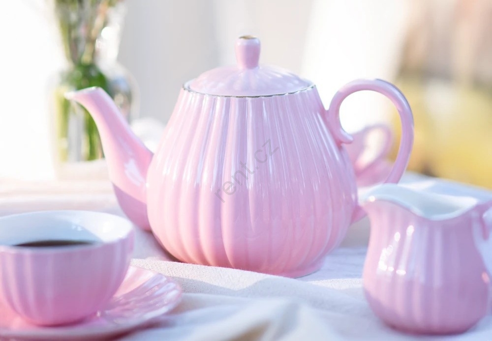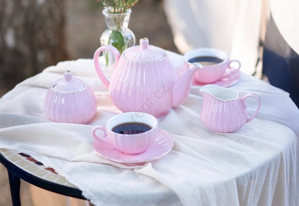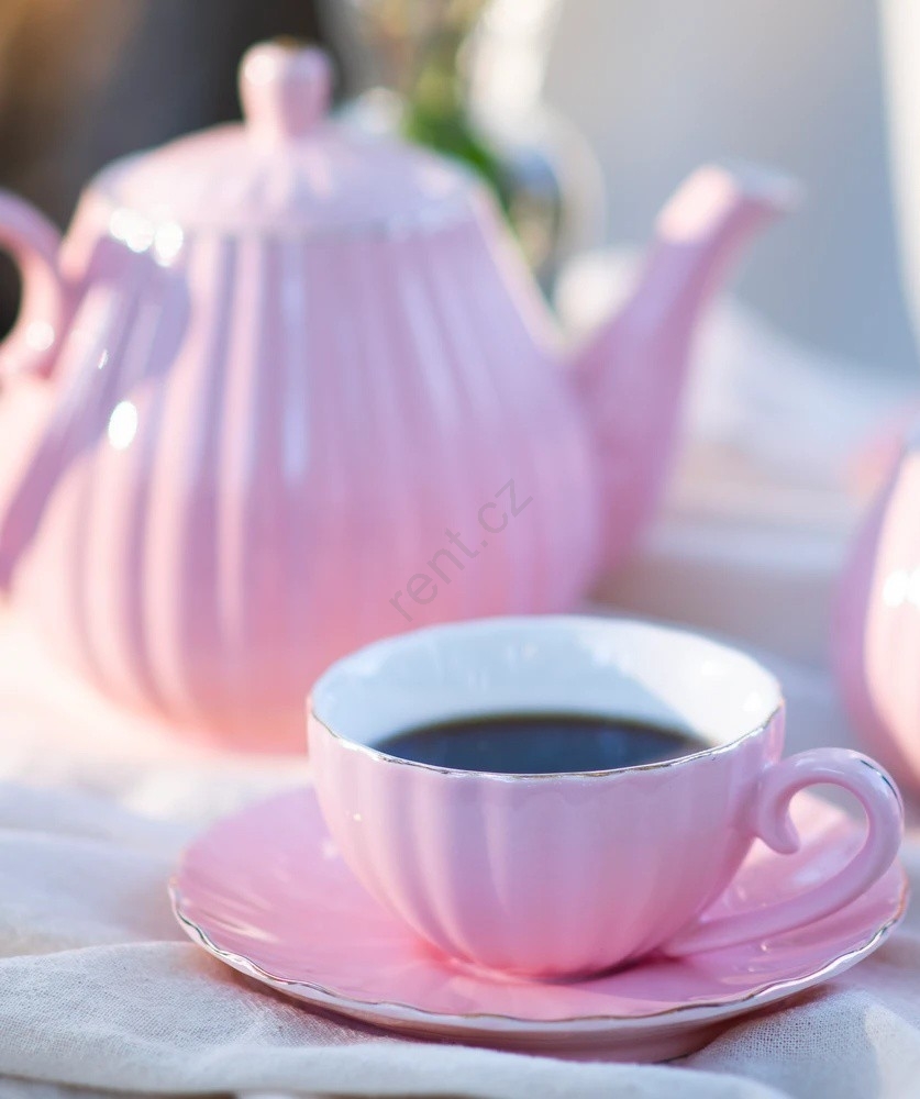 • Nadčasová sada porcelánového nádobí v růžové barvě.
