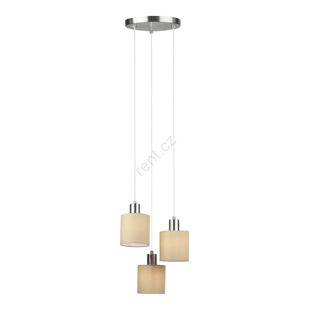 Trojité závěsné svítidlo Natina se vyznačuje moderním, decentním designem a barvami. Kovové tělo svítidla vyrobeno v hnědo-saténové chromové barevné kombinaci je doplněno válcovými textilními stínítky a kovovým dekoračním podstavcem. Šířka trojitého závěsného svítidla je 330 mm, průměr okrouhlé ozdobné podstavy je 220 mm a jeho vzdálenost od stěny je 1170 mm. Díky třem stínítko visícím v různých výškách bude toto závěsné svítidlo skutečně velkolepým řešením pro osvětlení vaší moderní obývacího pokoje nebo jídelny. Interiérové svítidlo Natina lze použít s třemi energeticky úspornými žárovkami s výkonem každá do 25 W. Pokud chcete vylepšit útulnou, intimní atmosféru, použijte žárovky vyzařující teplé bílé světlo. Typ závitu je E14. Trojité závěsné svítidlo Natina se dodává bez žárovek.