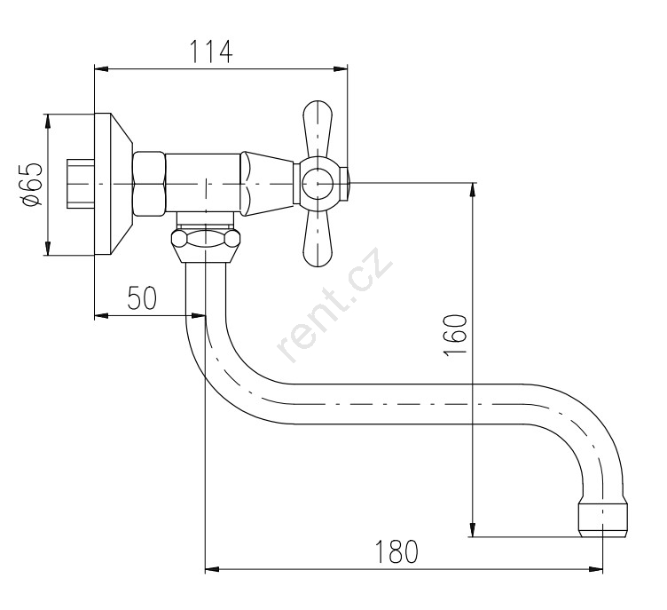 • Vodovodní nástěnná dřezová/umyvadlová baterie s kulatým ramínkem.