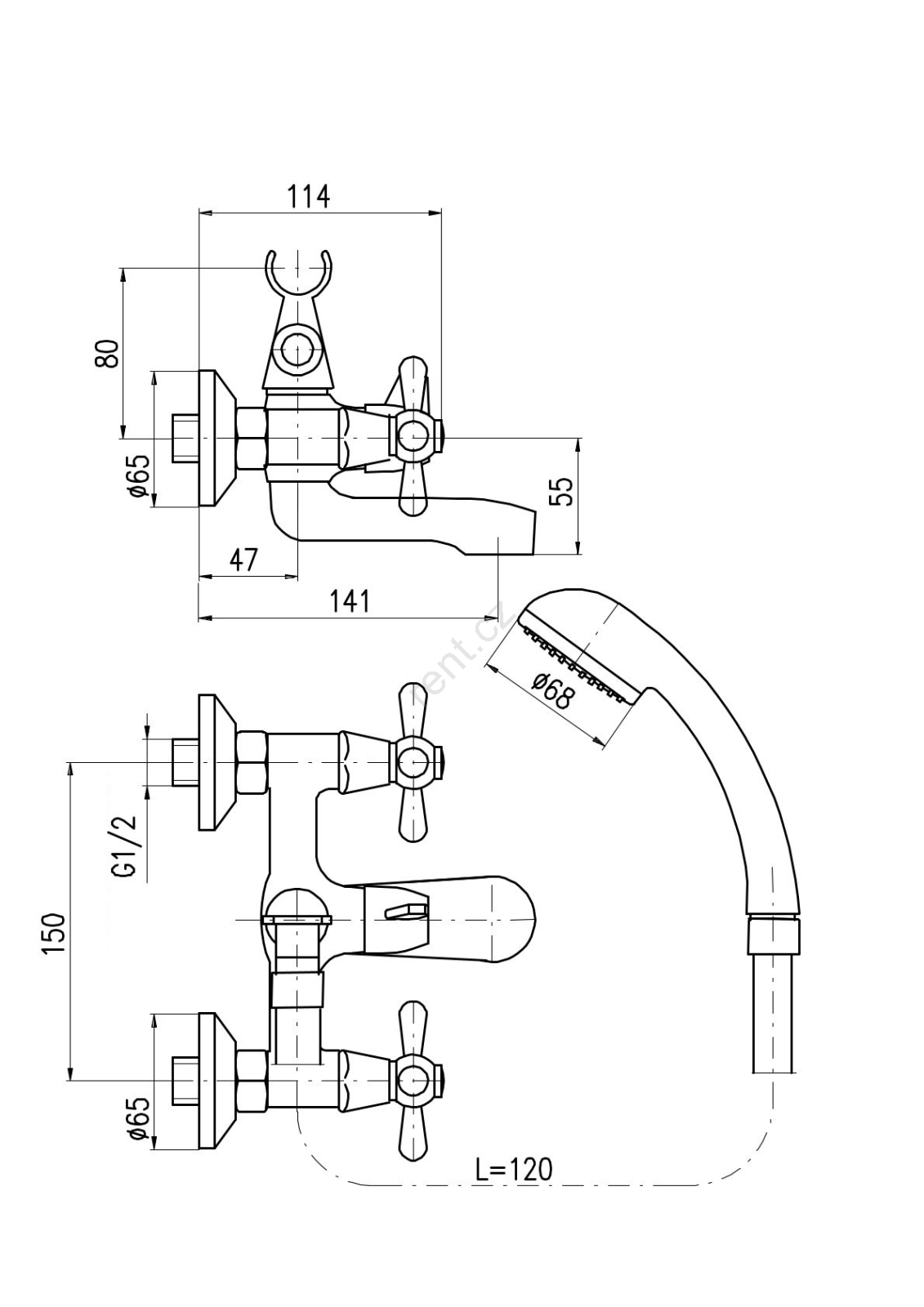 • Vanový set s nástěnnou vanovou baterií s keramickým přepínačem, s vidlicí na odkládání sprchy a se sprchou.
