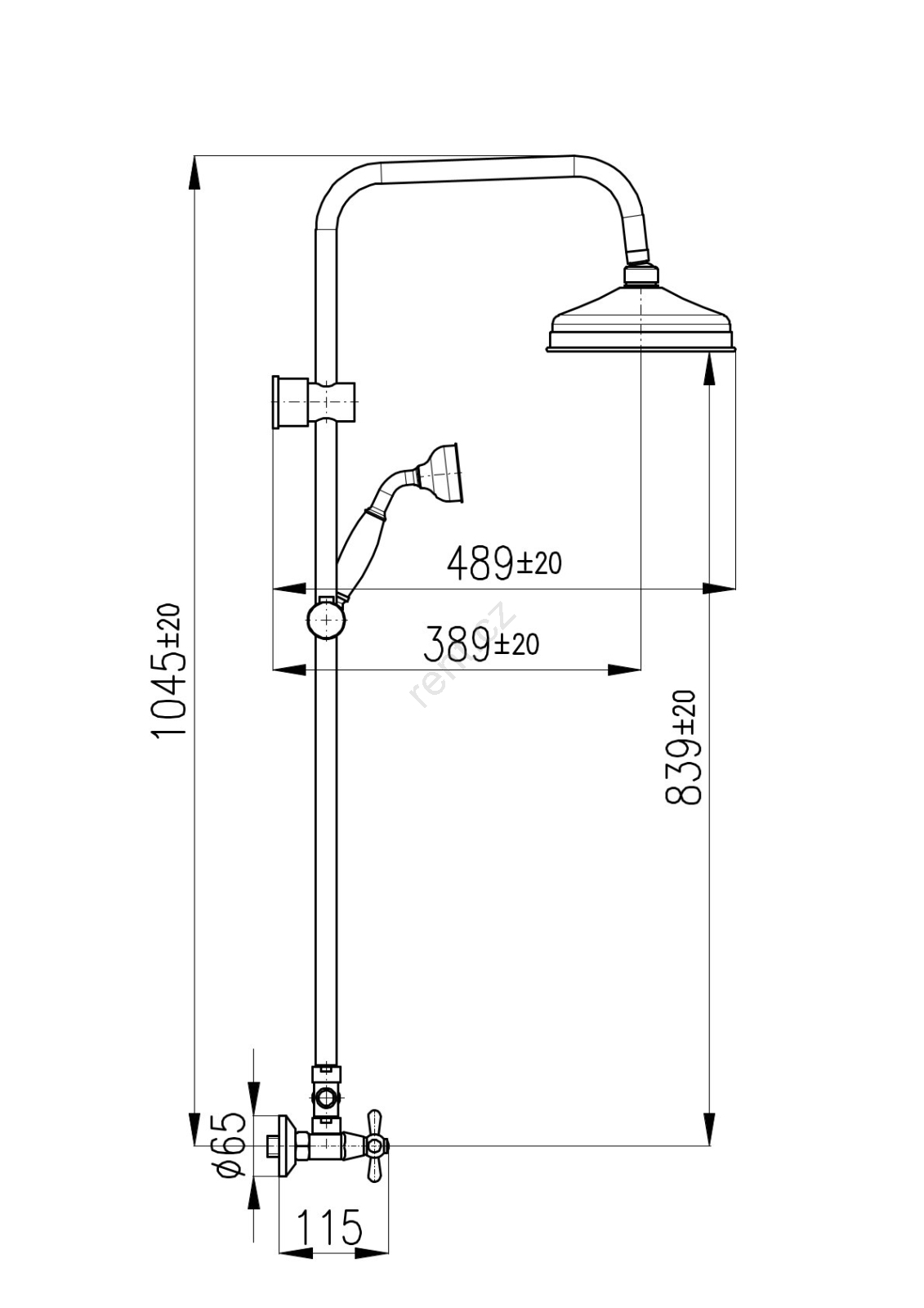 • Vodovodní nástěnná sprchová baterie s hlavovou a ruční sprchou.