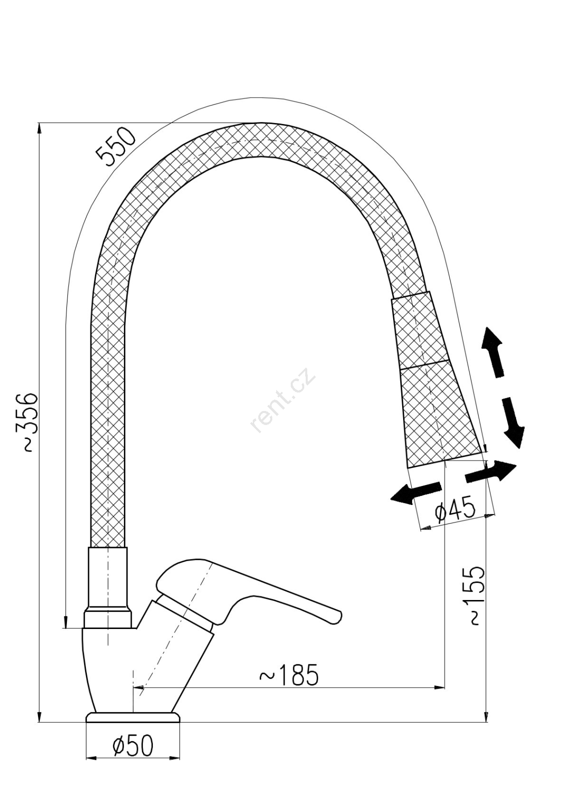 • Vodovodní baterie dřezová stojánková s flexibilním otočným ramínkem se sprchou.