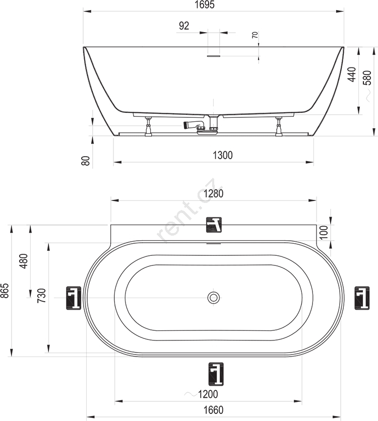 • Vanový odtokový komplet (tj. přepad, pileta, sifon, zápachová uzávěra) a podpora (nožičky) jsou součástí balení.