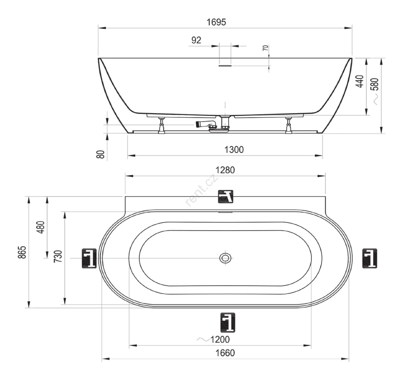 • Vanový odtokový komplet (tj. přepad, pileta, sifon, zápachová uzávěra) a podpora (nožičky) jsou součástí balení.