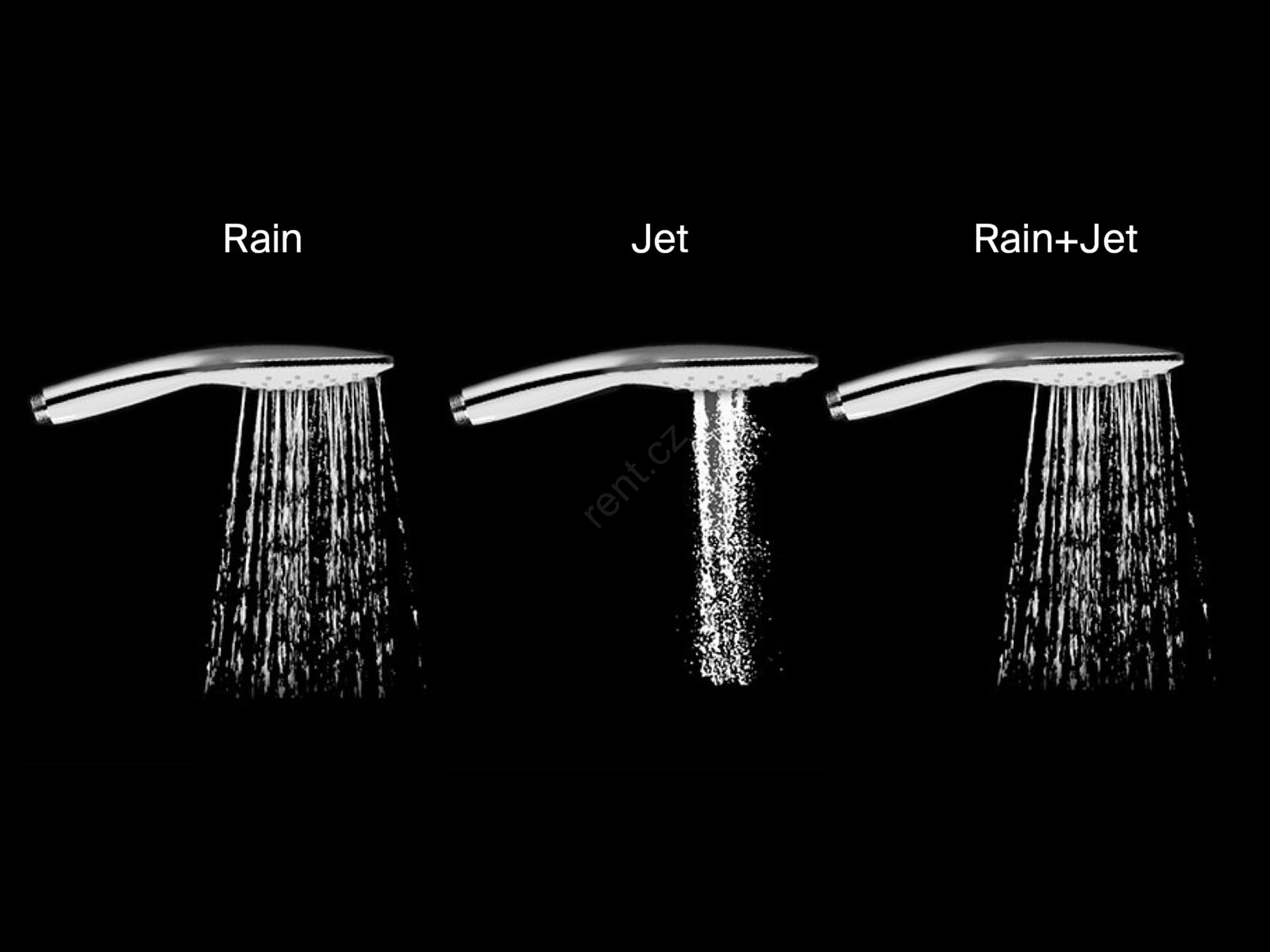 • Ruční sprcha disponuje třemi režimy – jemným Rain, silným Jet a jejich kombinací – a hlavici i držák lze jednoduše nastavit do libovolného úhlu.
