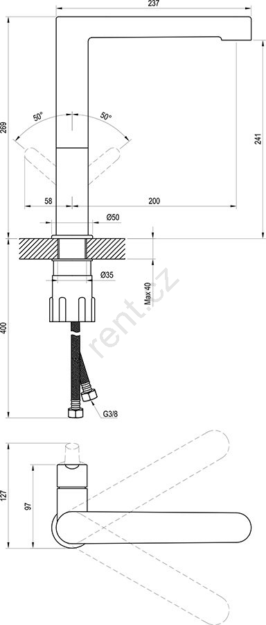 • Baterie je dodávána bez výpusti a obsahuje flexibilní připojovací hadičky o délce 450 mm s průměrem DN8 b.