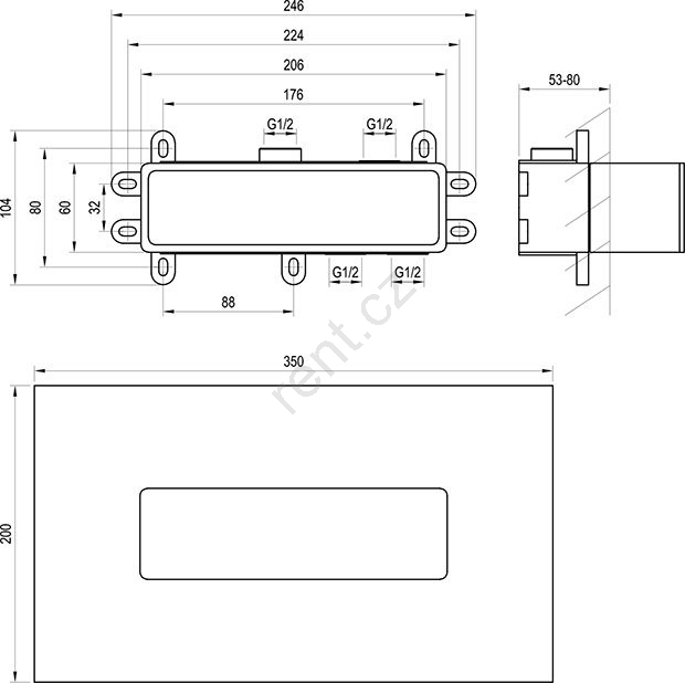 • R-box obsahuje materiál pro přichycení ke stěně, nezahrnuje přípojky pro vedení vody ani jiný vodoinstalační materiál.