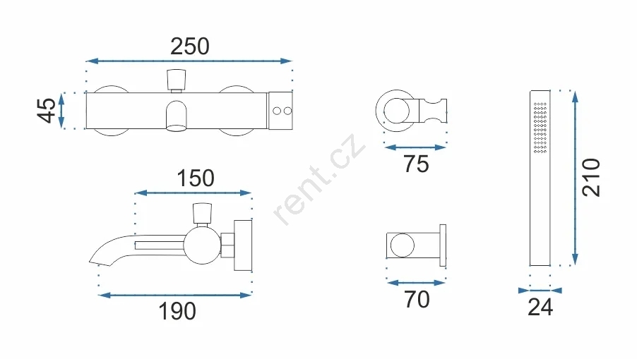 • Sada obsahuje: vanovou baterii, ruční sprchu, sprchovou hadici (190 mm), držák ruční sprchy.