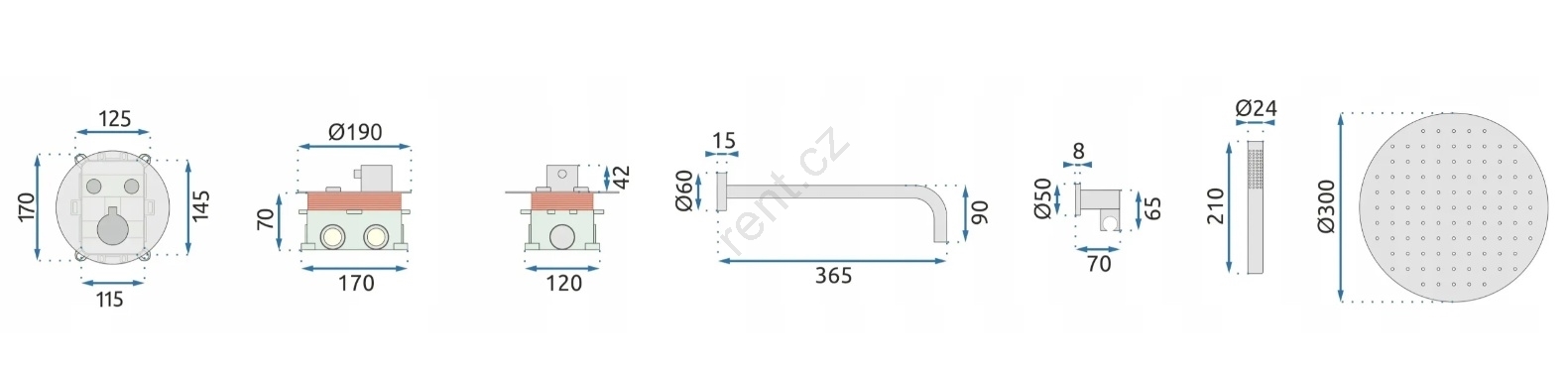 • Balení obsahuje: podomítkový box, kompletní baterie, rameno, ruční a hlavová sprcha, držák ruční sprchy, 150cm hadice.