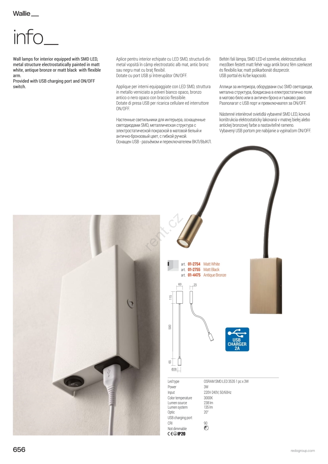 • Redo 01-2754 - LED Flexibilní lampička WALLIE LED/3W/230V USB CRI 90 bílá