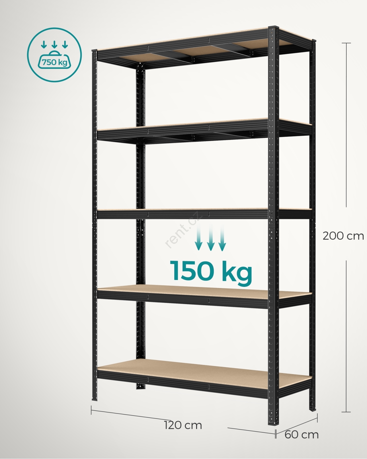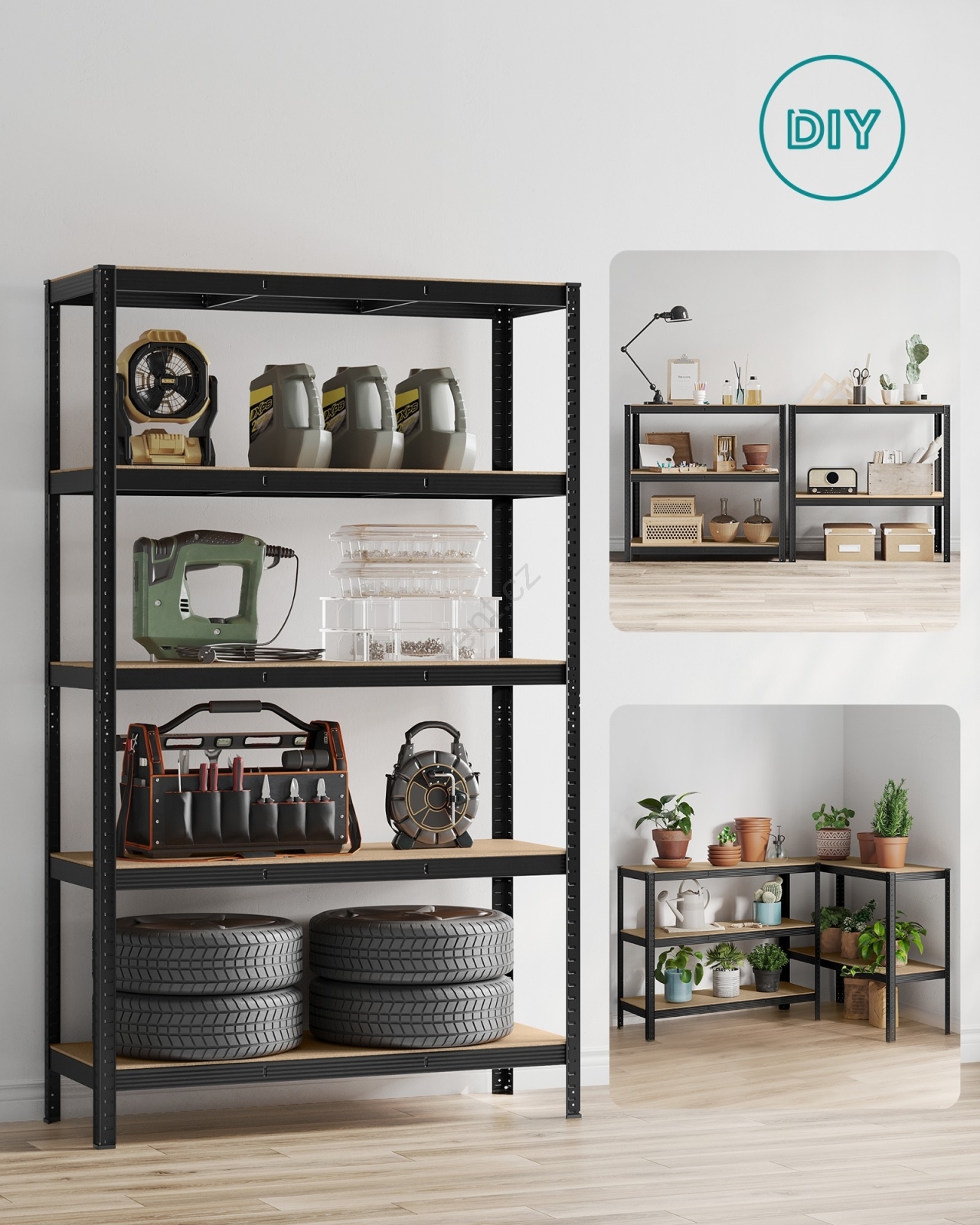 • Každá police unese až 150 kg a bezpečně unese barvy, nářadí a fitness vybavení.