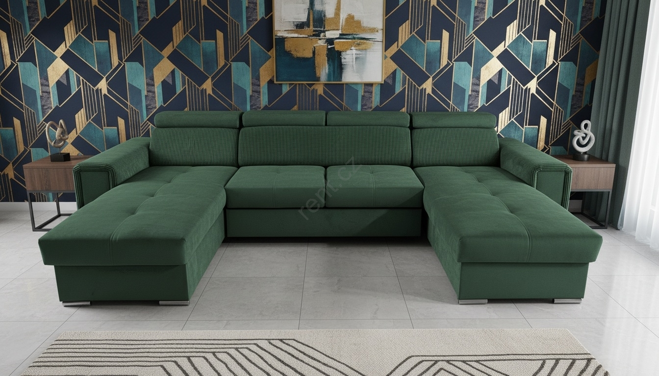 • Rozkládací sedací souprava s univerzálním rohem do U s úložným prostorem SALVADA zelená