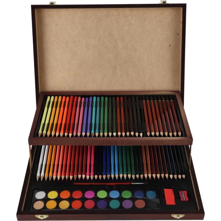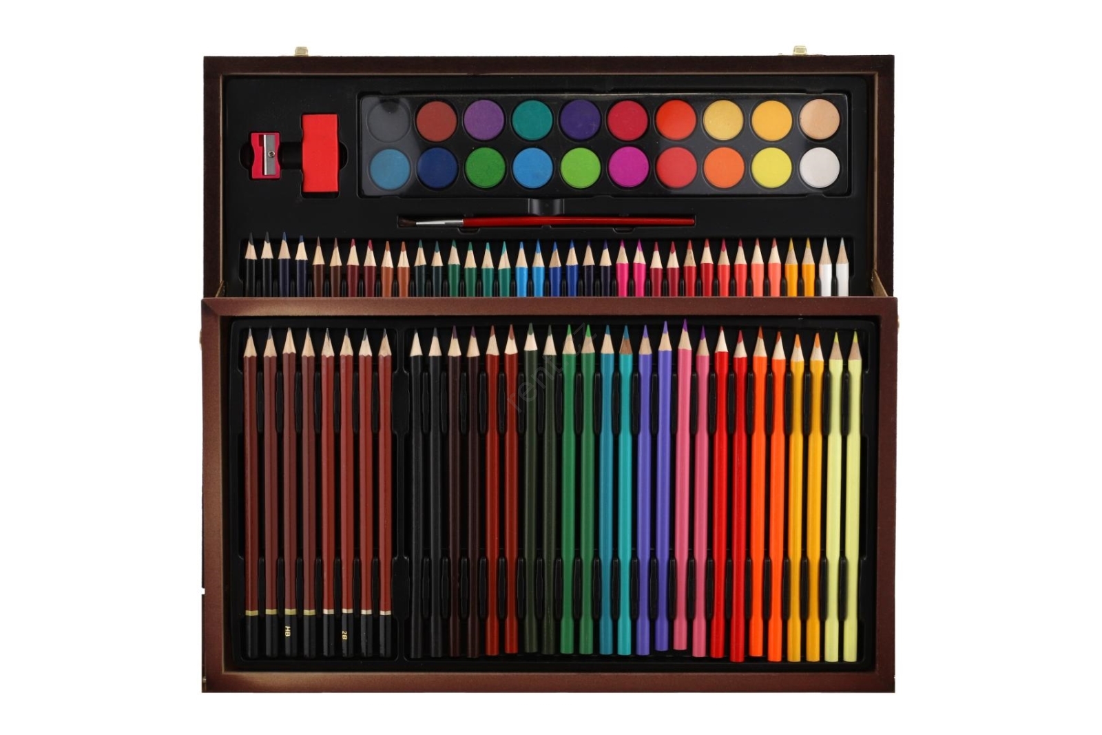 • Kufřík obsahuje pastelky, ořezávátko, gumu a vodové barvy se štětcem (celkem 91 ks).