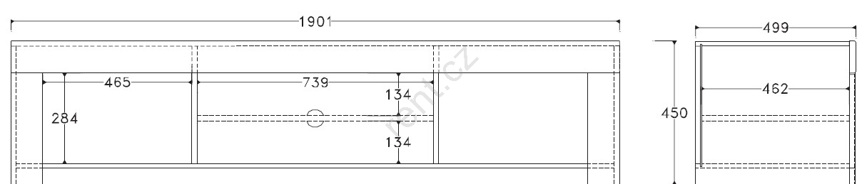 • Má dvě uzavřené boční přihrádky a dvě otevřené police, jedna s otvorem pro kabel, uprostřed.