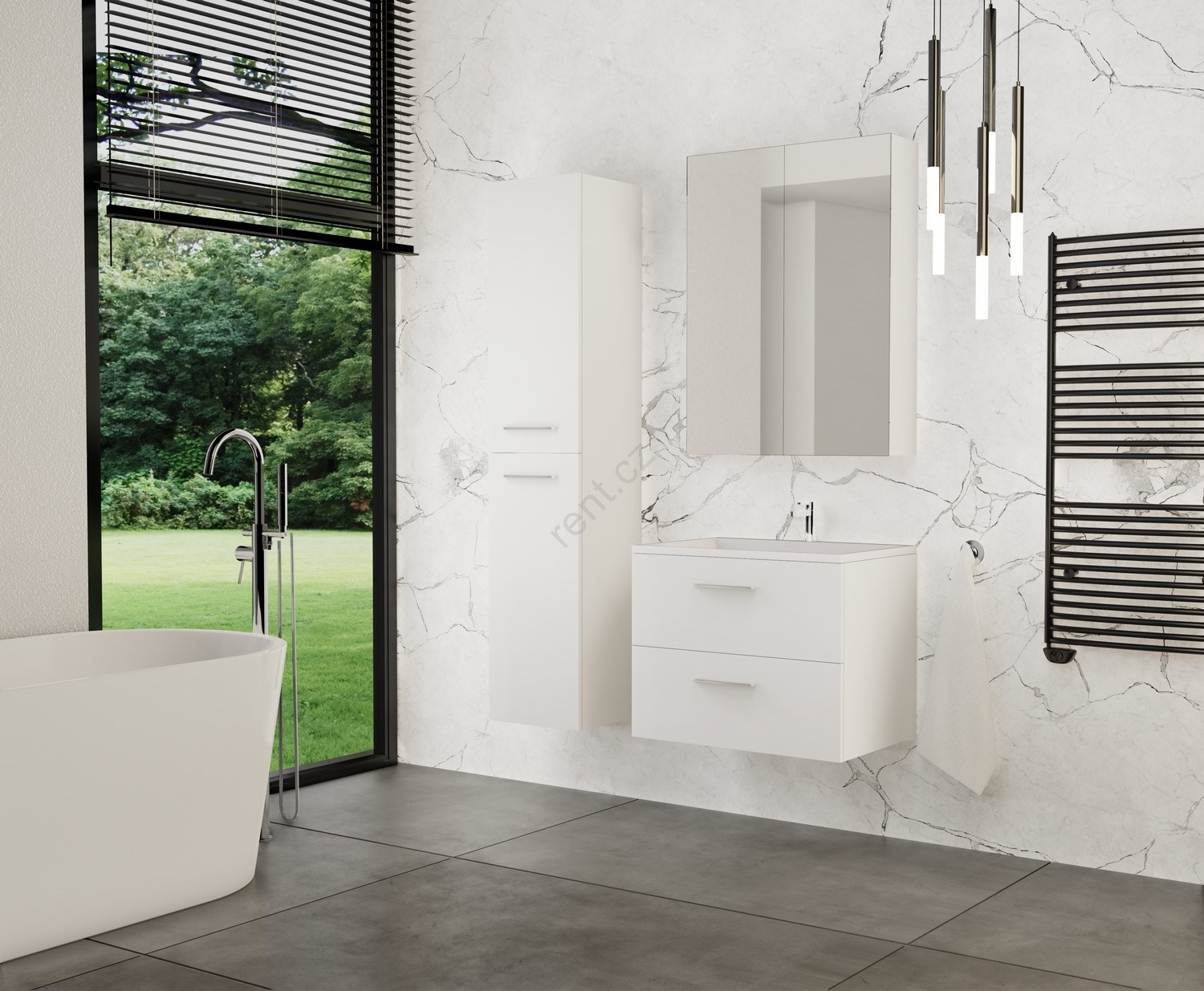 • SET KATE - Elegantní koupelnová skříňka s umyvadlem, zrcadlová skříňka a nástěnná skříňka.