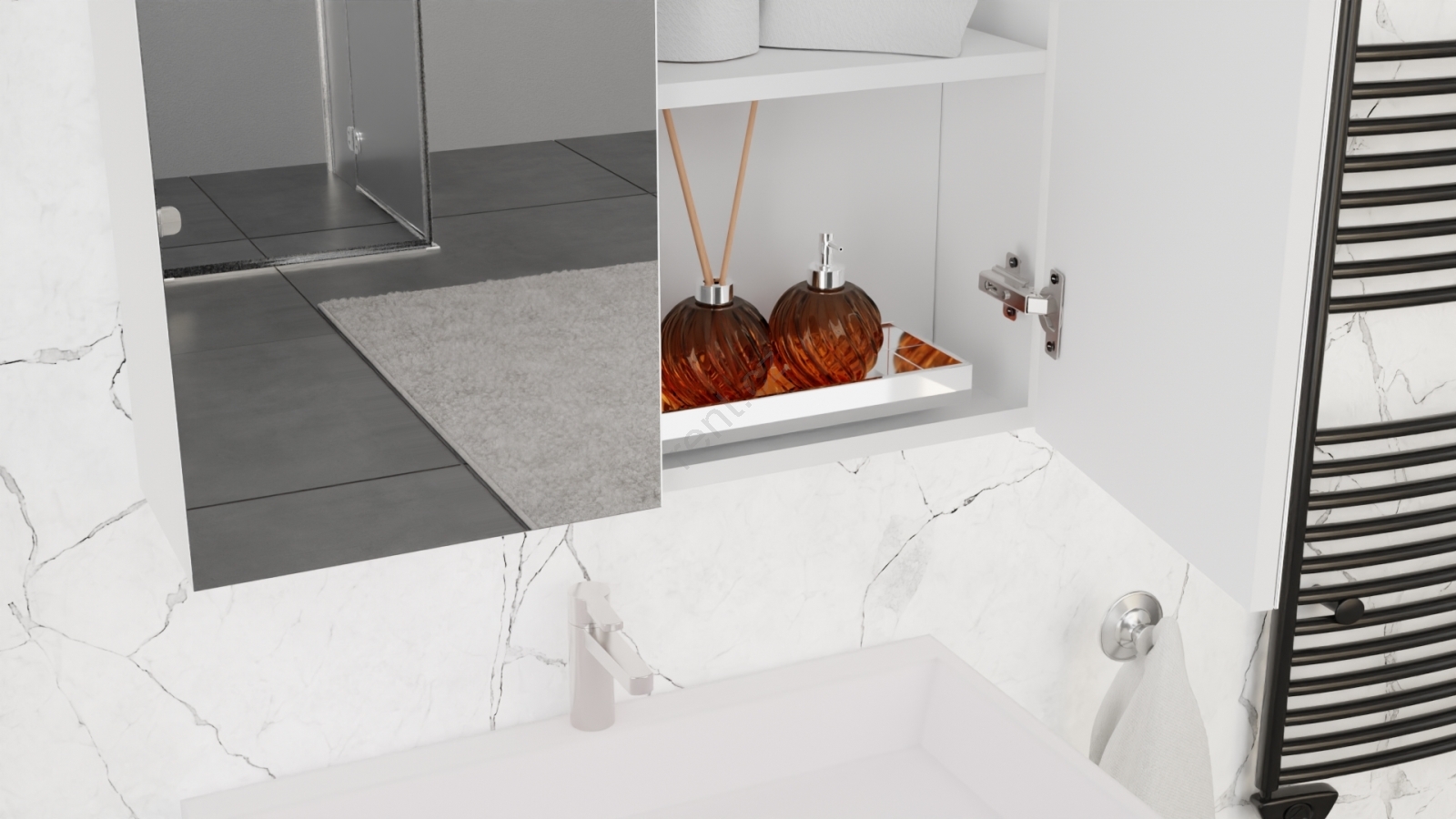 • Celý set je určen k zavěšení na zeď, což zajišťuje elegantní vzhled i snadné čištění.