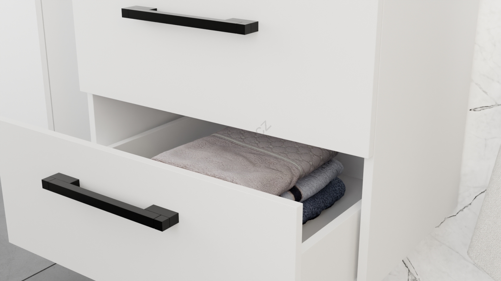 • Skříňka pod umyvadlo nabízí dvě praktické zásuvky, přičemž její horní část je navržena tak, aby maximálně využila prostor kolem baterie a odpadního potrubí.