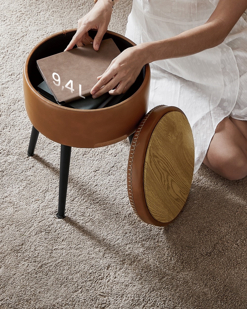 • Uvnitř taburetu je prostor (9,4 l) pro skrytí elektroniky, knih, dek a dalších drobností.