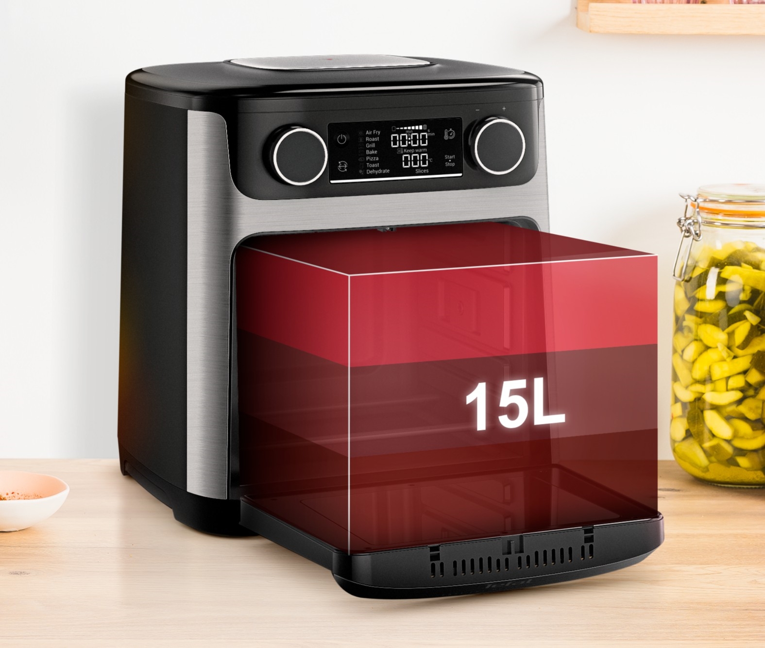 • Velký objem 15 litrů se třemi výškovými úrovněmi pro více pokrmů najednou.