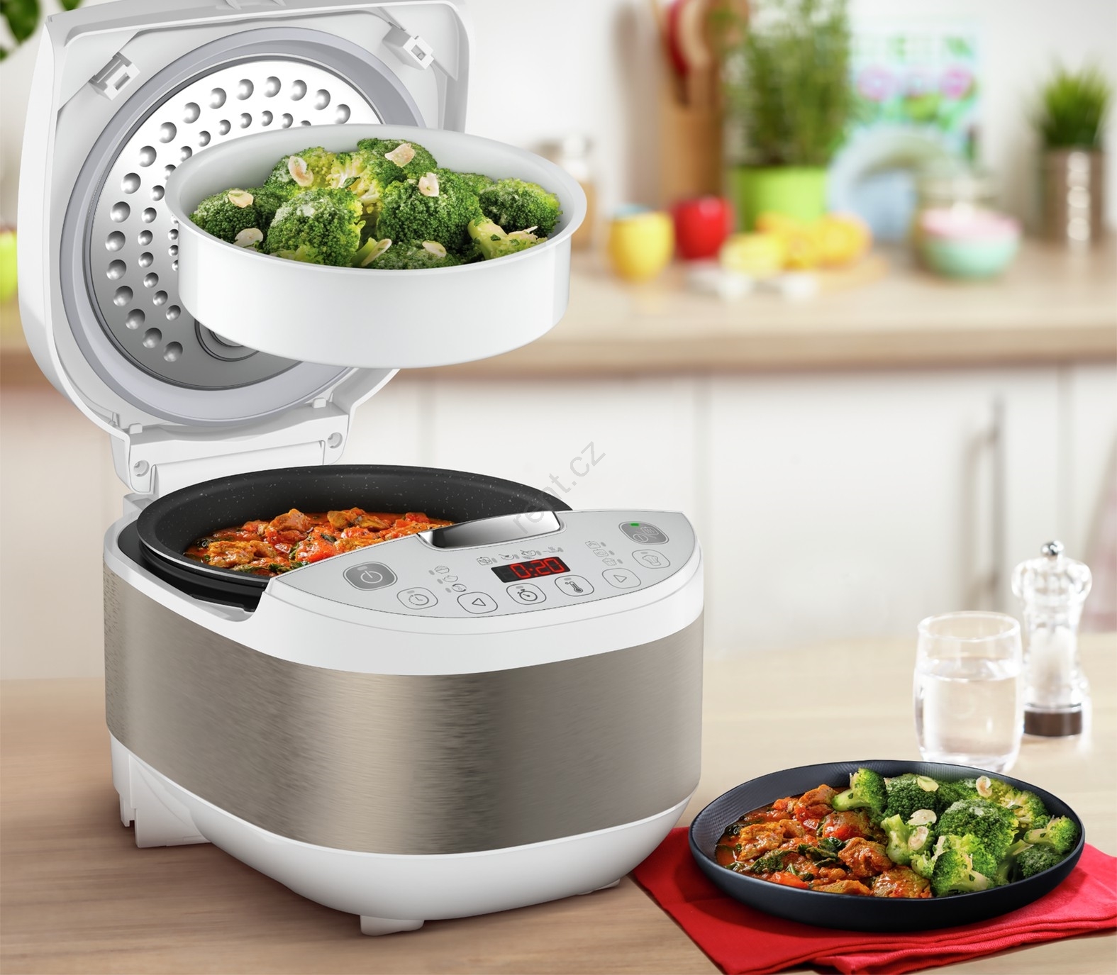 • Součástí balení je bohaté příslušenství: napařovací košík, lžíce, naběračka a odměrka.