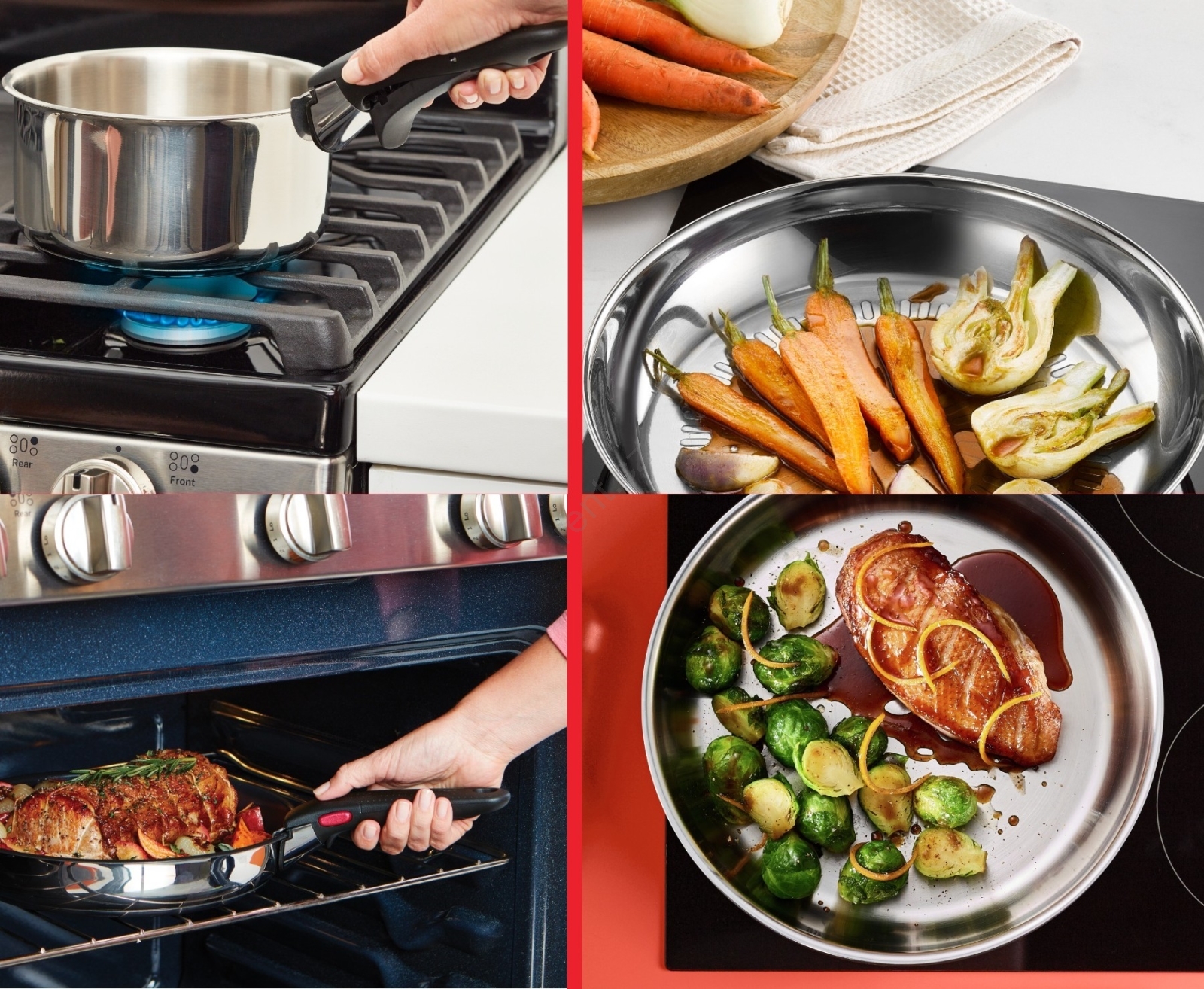 • Sada Tefal obsahuje tři pánve (22 cm, 24 cm a 28 cm), dva rendlíky (16 cm a 18 cm) a odnímatelnou rukojeť.