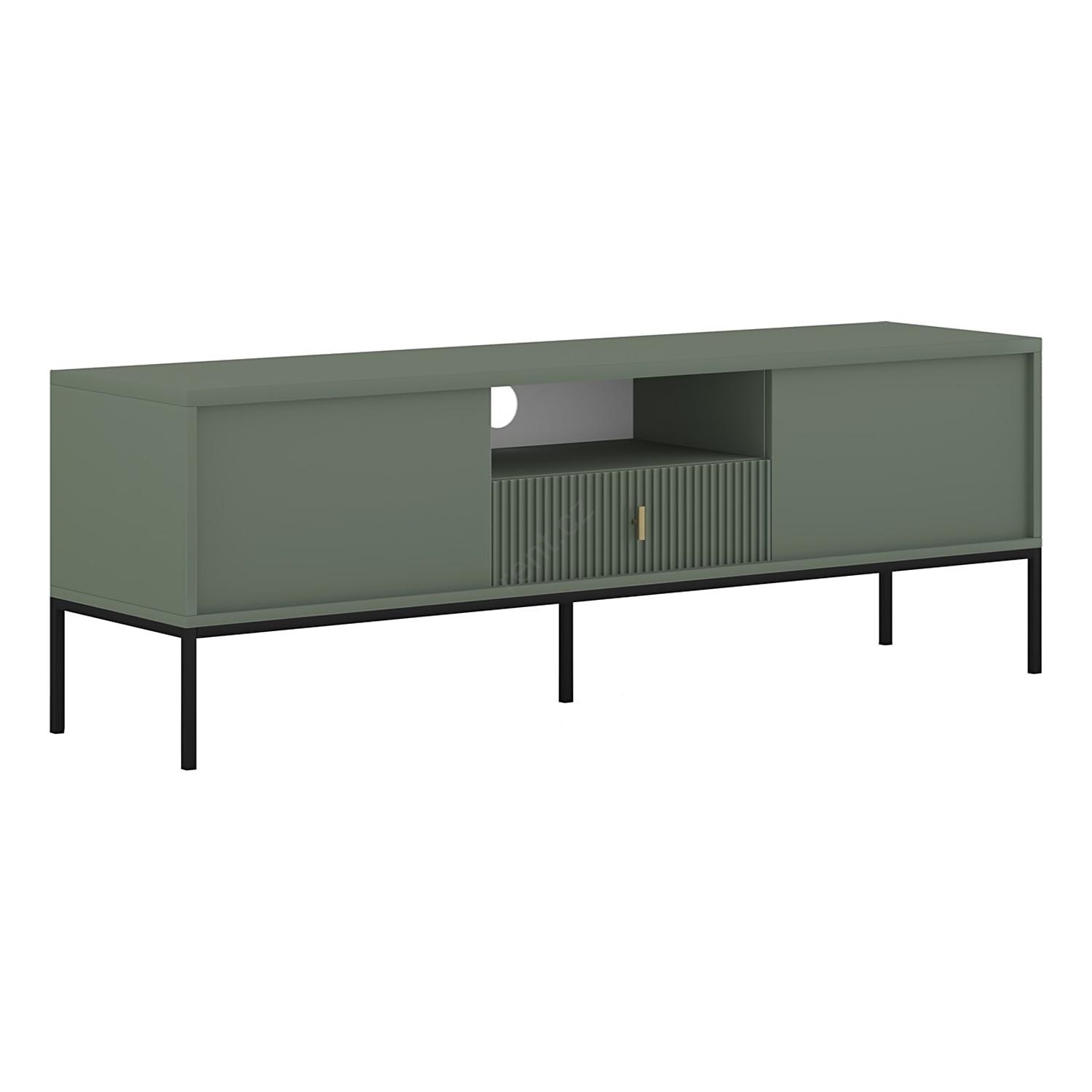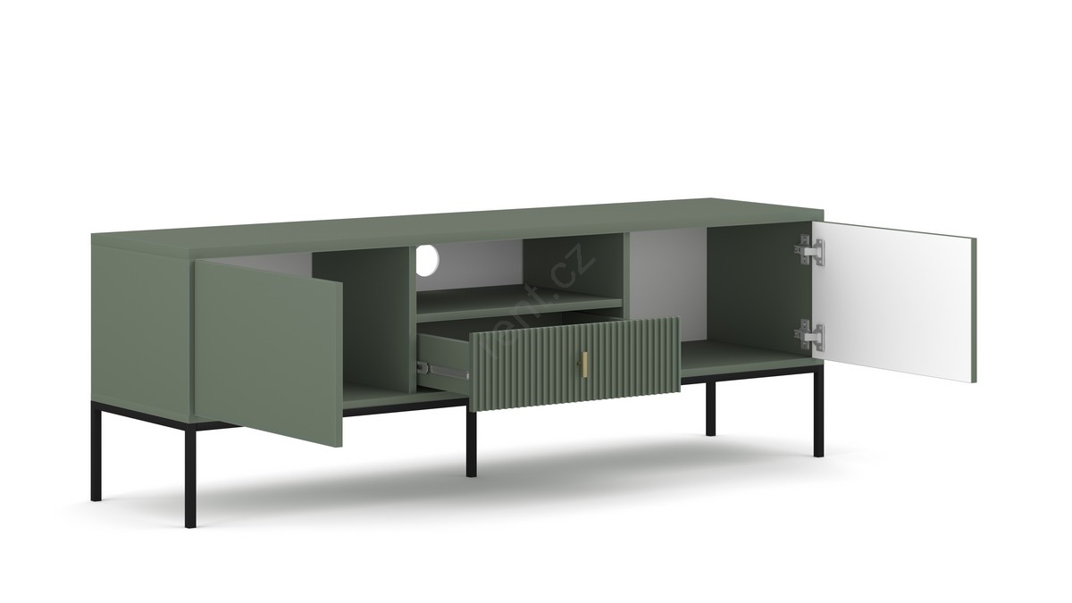 • Má dvě uzavřené boční přihrádky, otevřenou polici s otvorem pro kabel uprostřed a zásuvku pod policí s žebrováním.